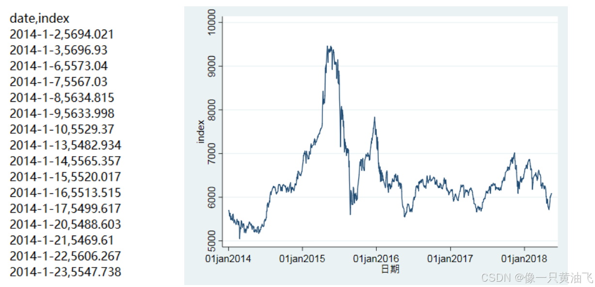 深证成份股指数是深圳证券交易所编制的一种成份股指数,是从上市的所有股票中抽取具有市场代表性的40家上市公司的股票作为计算对象,并以流通股为权数计算得出的加权股价指数,综合反映深交所上市 A、B股的股价走势。成份B股指数变更为包含深圳市场10只B股的B股总收益指数。我们将时间区间选取为2014年1月至2018年5月,共计1064个交易日的收盘价数据,在下文中,分别建立了ARMA模型和GARCH模型对其收益率进行了预测,得到了良好的结果。 ( 代号:399003 )