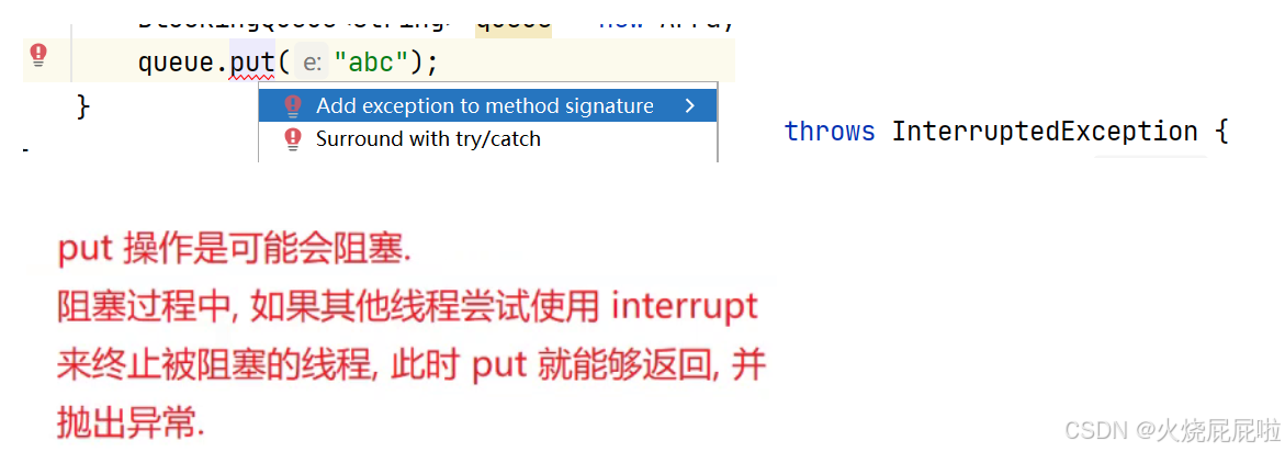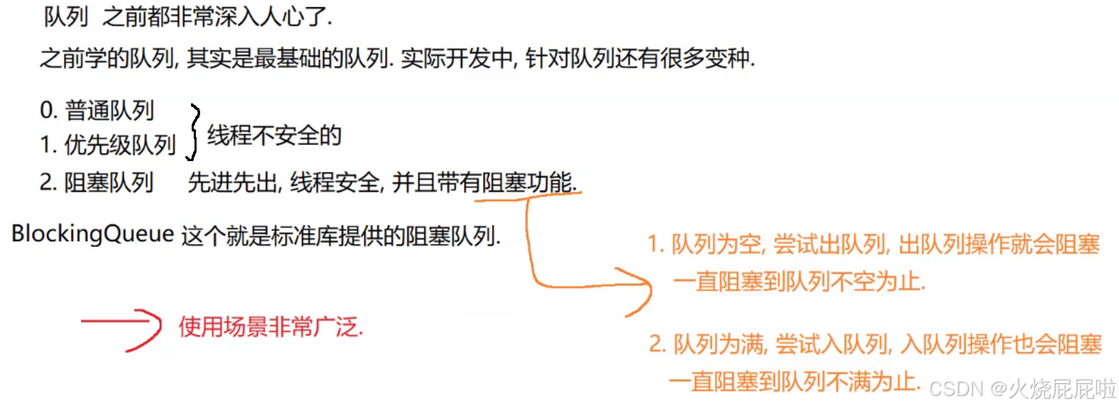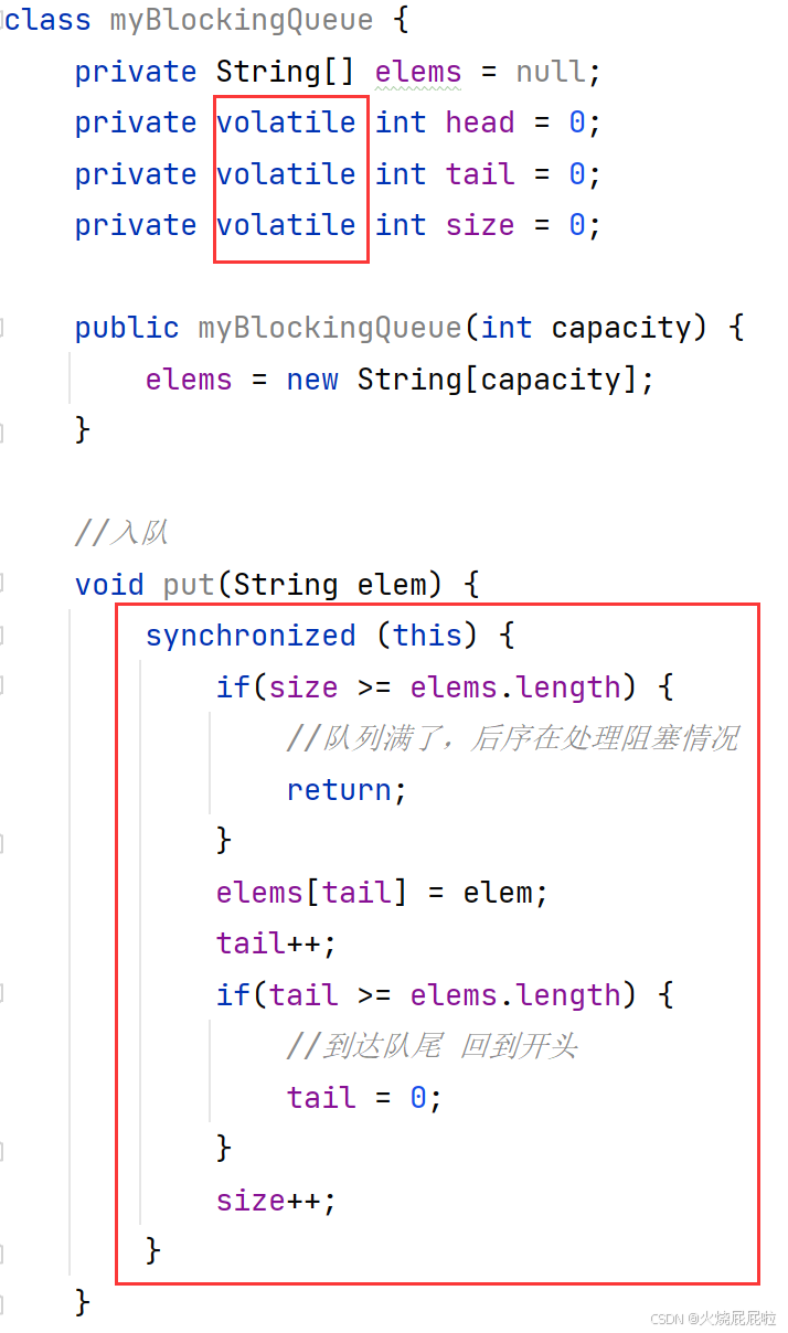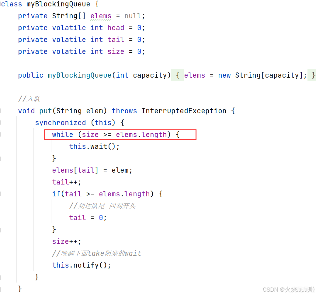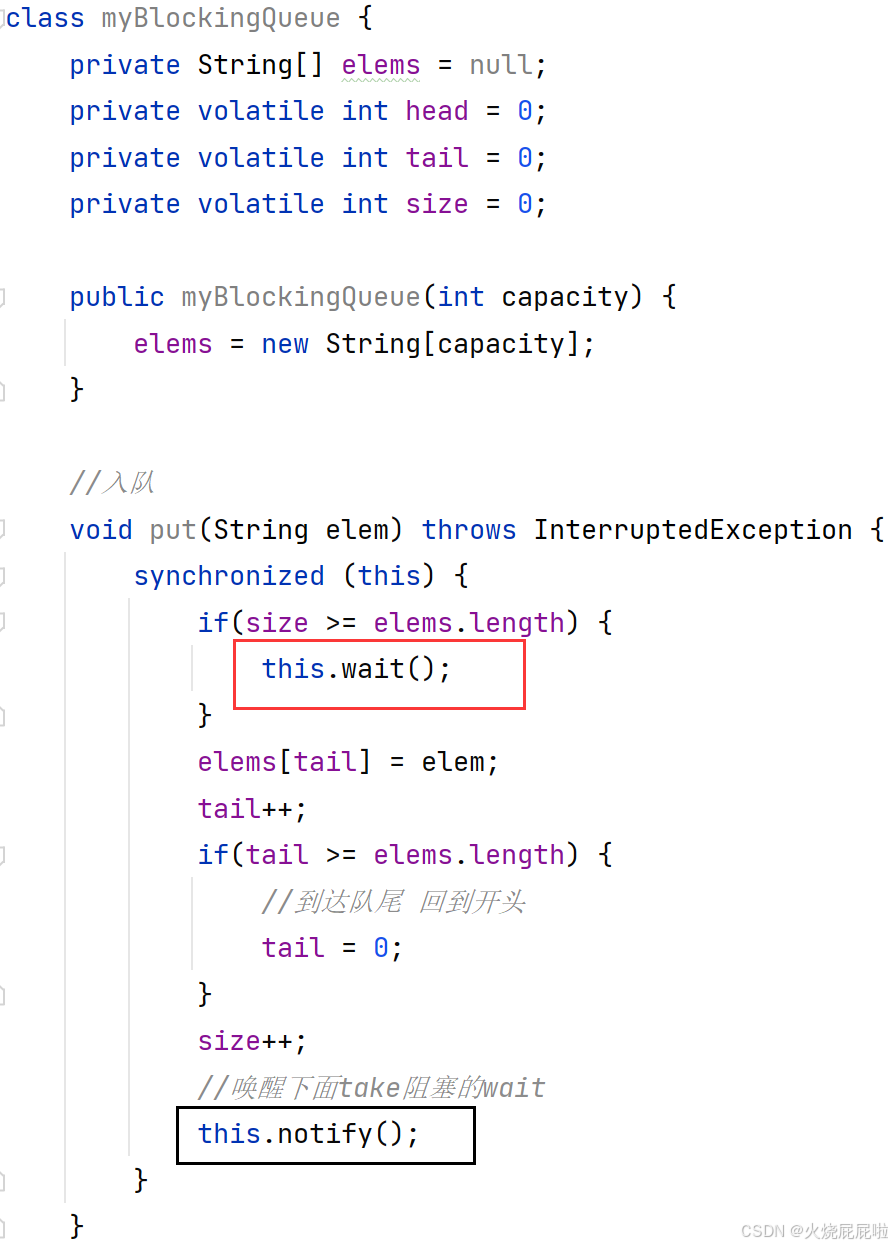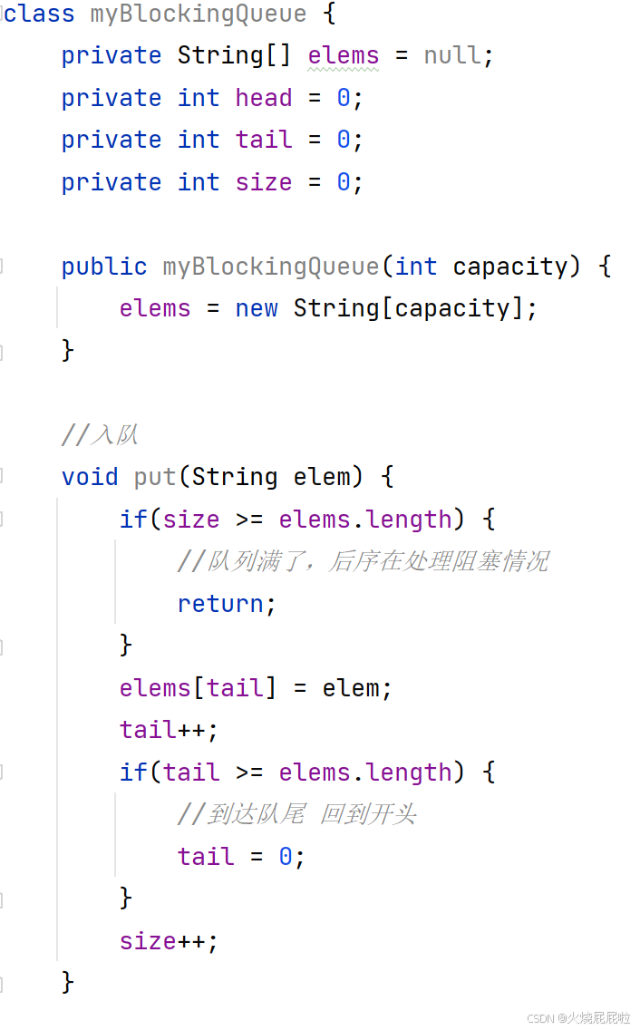 阻塞队列只需要考虑入队列和出队列即可,阻塞队列没有"取队首元素"操作(也不是没有,只不过没有阻塞功能)。