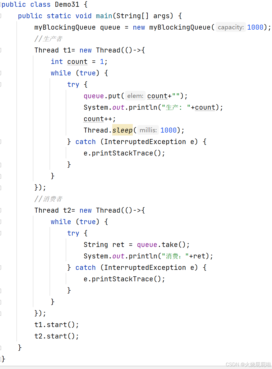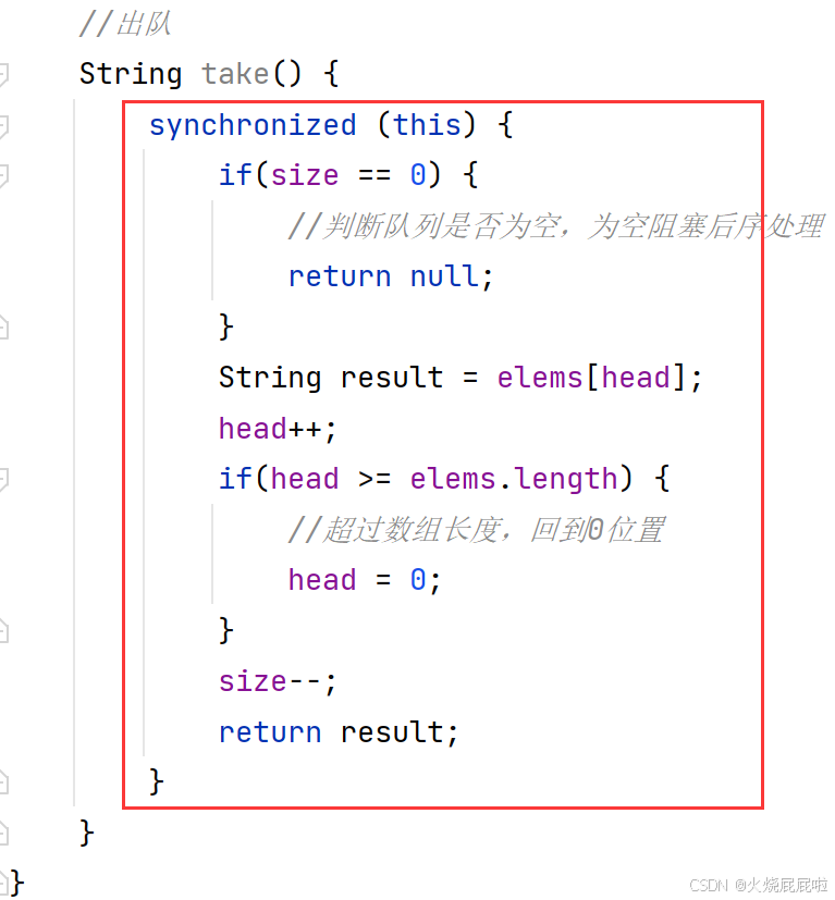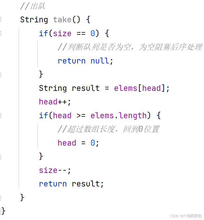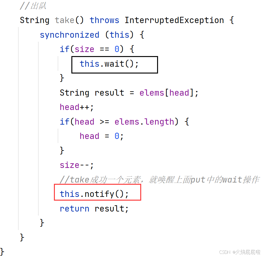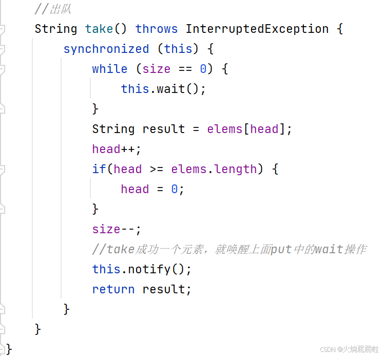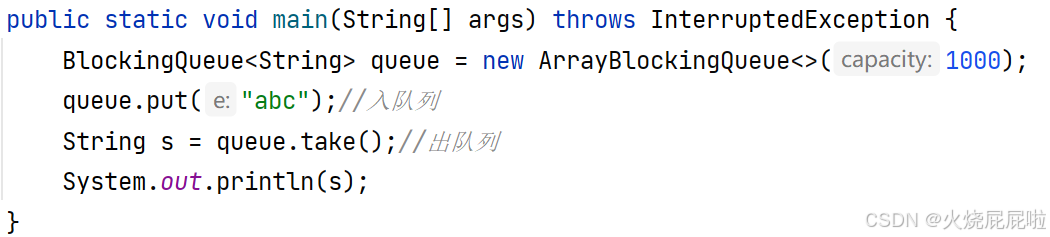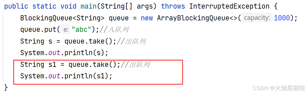 如果说入队只入了一个元素,出队的时候出两次,那么第二次打印的时候,此时的take就被阻塞到了,一直阻塞到有其他线程往这个队列里面插入元素为止