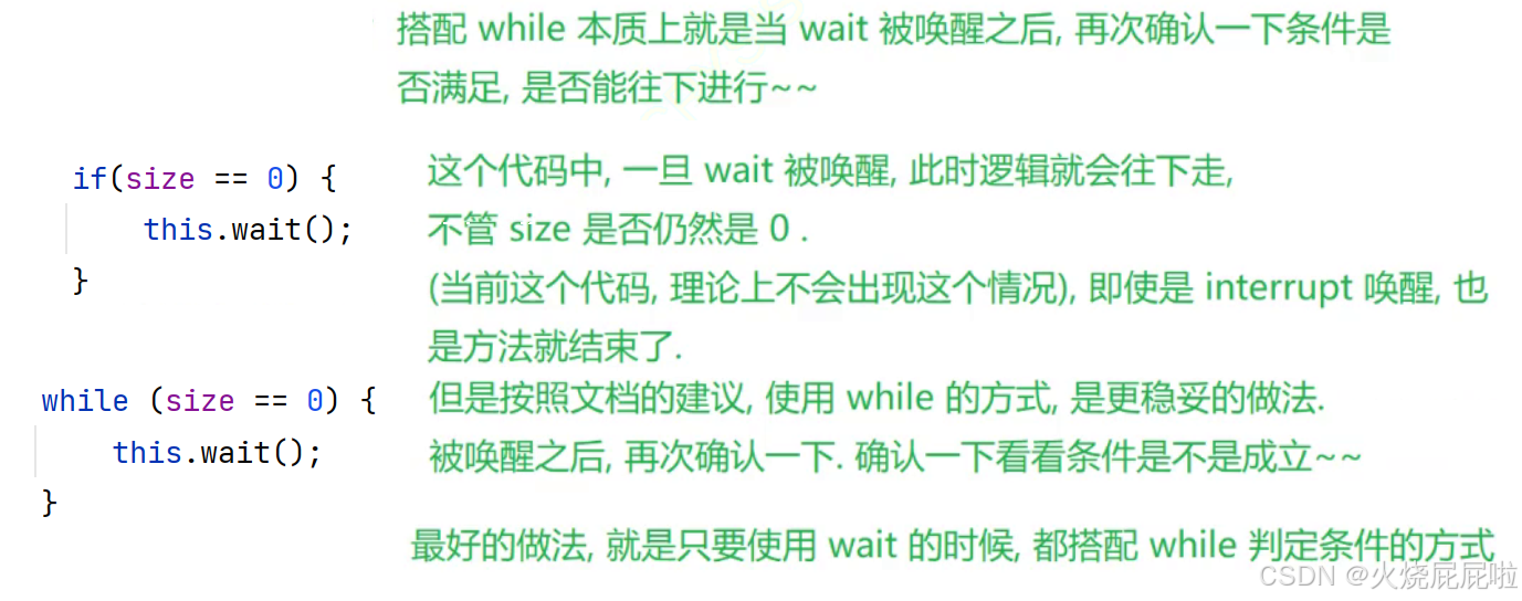 在 wait 源码中注释说,wait 不仅仅会被 notify 和 notifyAll 唤醒,也可能会被其他线程唤醒,比如 interrupt。所以建议我们使用 wait 的时候搭配 while 来使用。