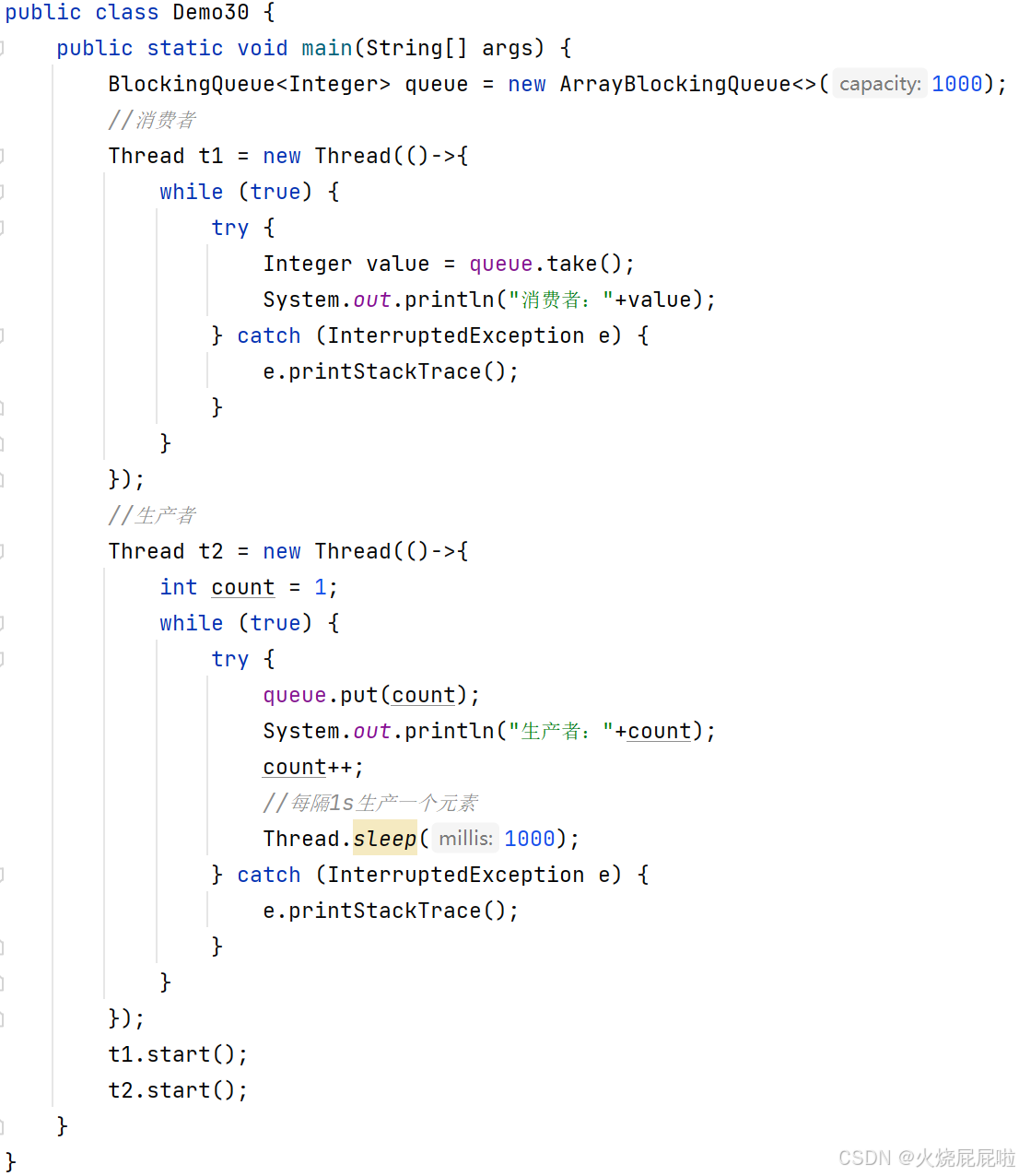 虽然生产者是每隔1s生产一个元素,但是消费者里面会跟着生产者的节奏进行打印,消费者没有sleep,take自带的阻塞特性,也使消费者处于一个比较慢的速度进行消费。