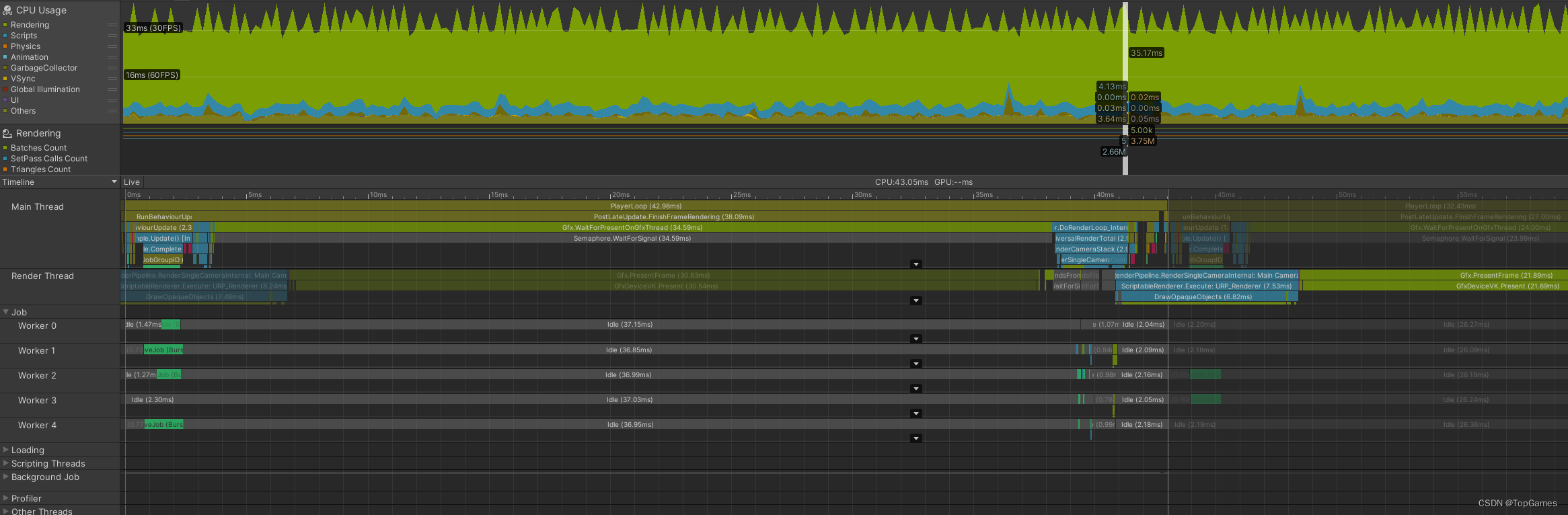 Profiler中可以看到,耗时主要来自GPU等待CPU组织和上传渲染数据。 而Entities Graphics内部也是通过Batch Renderer Group接口实现,由此可以推断,被吹爆的Entities在移动端因该也是"水土不服":