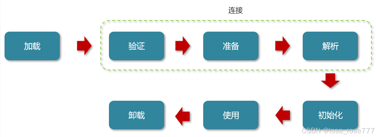 类从加载到JVM中开始,它的整个生命周期包括了:加载、验证、准备、解析、初始化、使用和卸载七个阶段。其中,验证、准备和解析这三个部分统称为连接