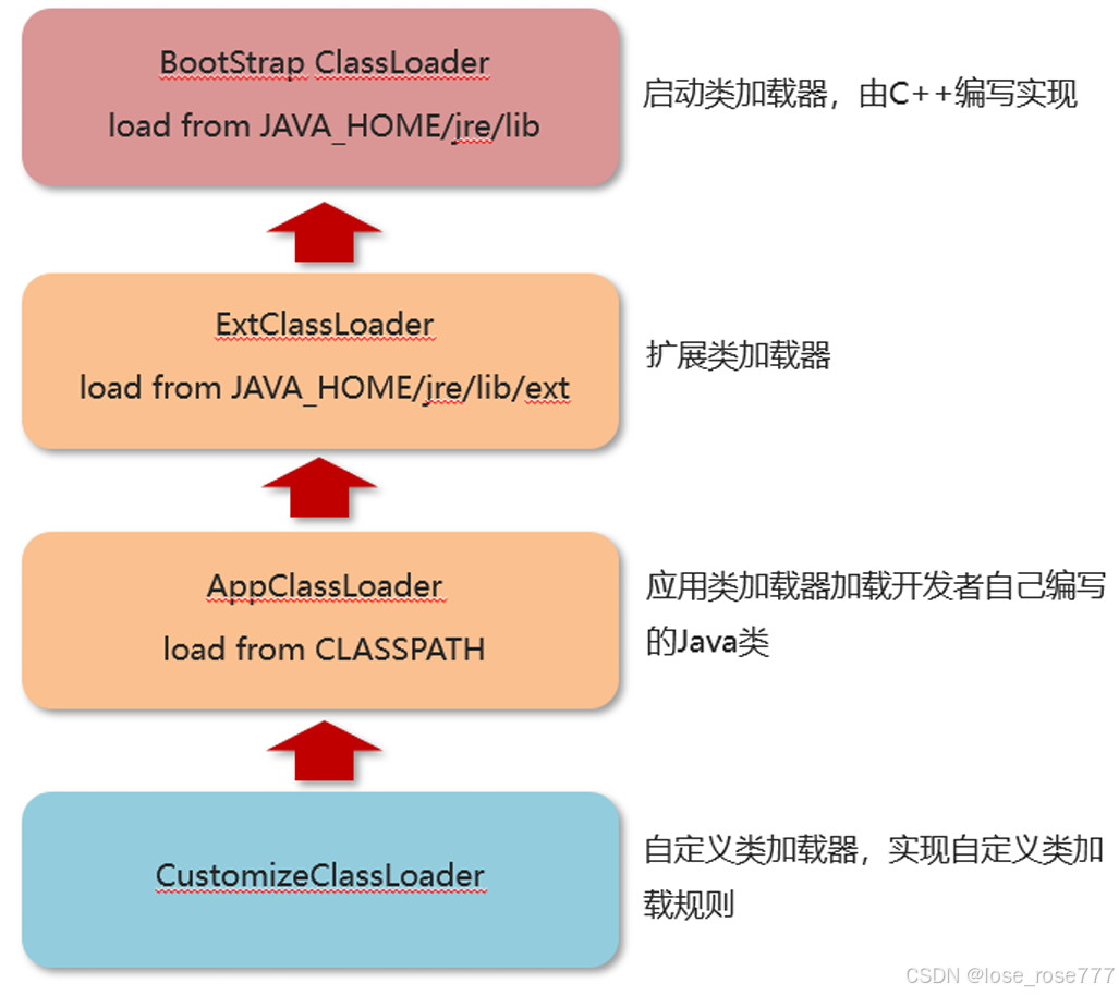 如果一个类加载器在接到加载类的请求时,它首先不会自己尝试去加载这个类, 而是把这个请求任务委托给父类加载器去完成,依次递归,如果父类加载器可以 完成类加载任务,就返回成功;只有父类加载器无法完成此加载任务时,才由下一级去加载