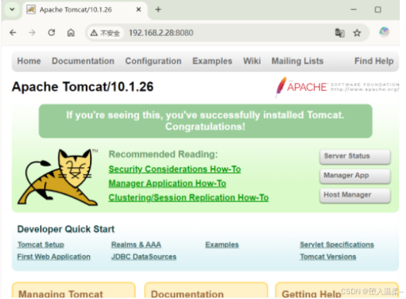 #使用wget下载tomcat包 wget https://dlcdn.apache.org/tomcat/tomcat-10/v10.1.26/bin/apache-tomcat-10.1.26.tar.gz #查看有没有将包下载下来 [root@002 ~]# ls anaconda-ks.cfg jdk-22_linux-x64_bin.tar.gz nginx-1.26.1.tar.gz apache-tomcat-10.1.26.tar.gz nginx-1.26.1 #解压 [root@002 ~]# tar -zxvf apache-tomcat-10.1.26.tar.gz #将apache tomcat移动到/usr/local/mulu下,改名 tomcat [root@002 ~]# mv apache-tomcat-10.1.26 /usr/local/tomcat/ [root@002 ~]# ls /usr/local/tomcat/ bin CONTRIBUTING.md logs RELEASE-NOTES webapps BUILDING.txt lib NOTICE RUNNING.txt work conf LICENSE README.md temp #启动服务 [root@002 ~]# /usr/local/tomcat/bin/startup.sh Using CATALINA_BASE: /usr/local/tomcat Using CATALINA_HOME: /usr/local/tomcat Using CATALINA_TMPDIR: /usr/local/tomcat/temp Using JRE_HOME: /usr/local/jdk22/ Using CLASSPATH: /usr/local/tomcat/bin/bootstrap.jar:/usr/local/tomcat/bin/tomcat-juli.jar Using CATALINA_OPTS: Tomcat started. [root@002 ~]# netstat -lnput|grep java tcp6 0 0 127.0.0.1:8005 :::* LISTEN 1582/java tcp6 0 0 :::8080 :::* LISTEN 1582/java