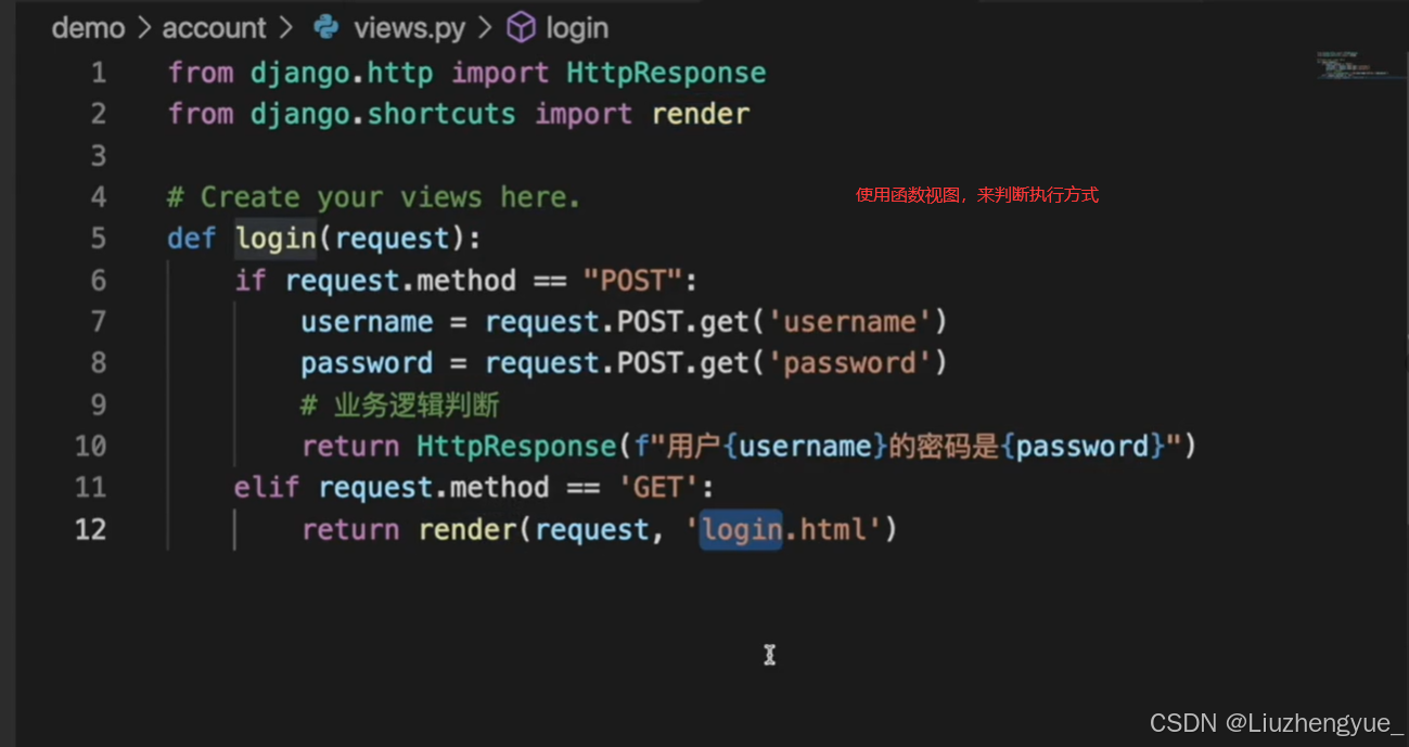 from django.shortcuts import HttpResponse from django.shortcuts import render def login(request): return render(request, 'login.html') #表示导入的html文件