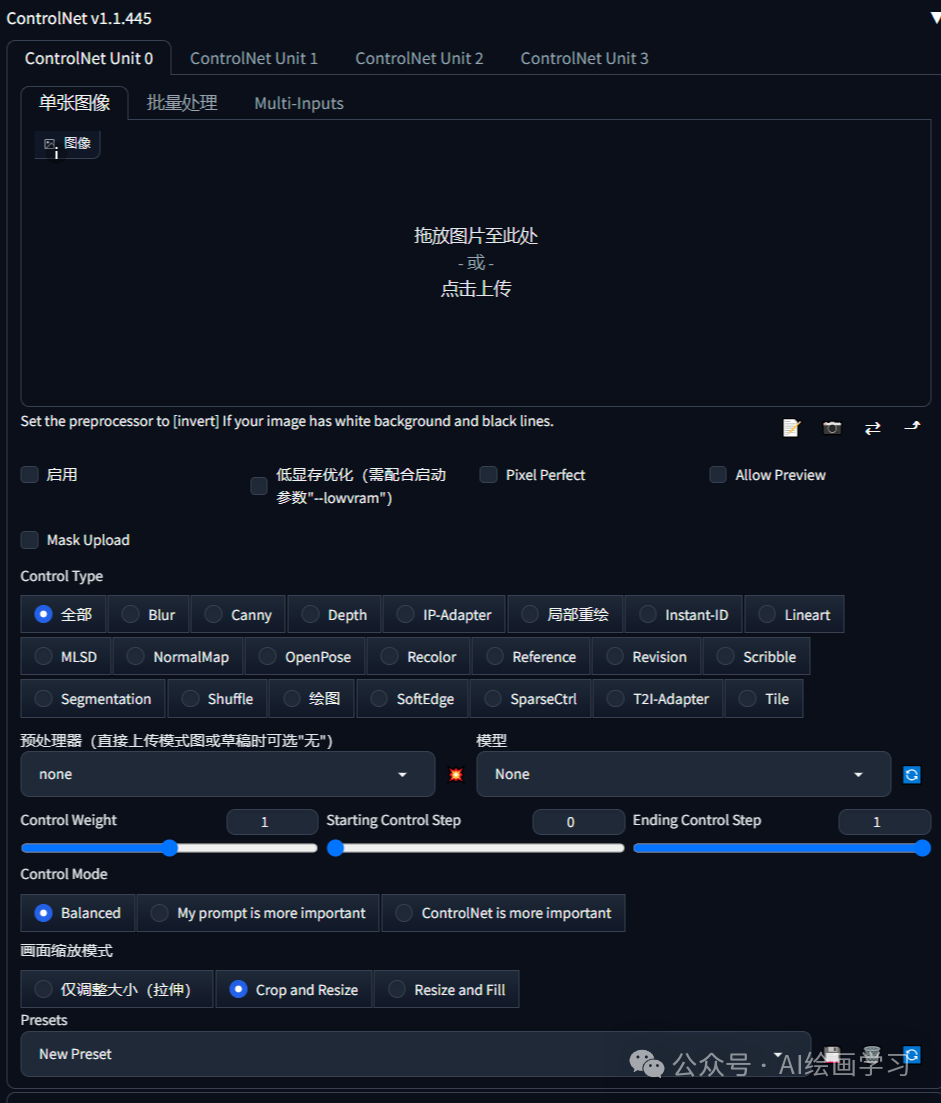 安装后重启,在文生图或图生图里面可以找到对应的controlnet设置模块: