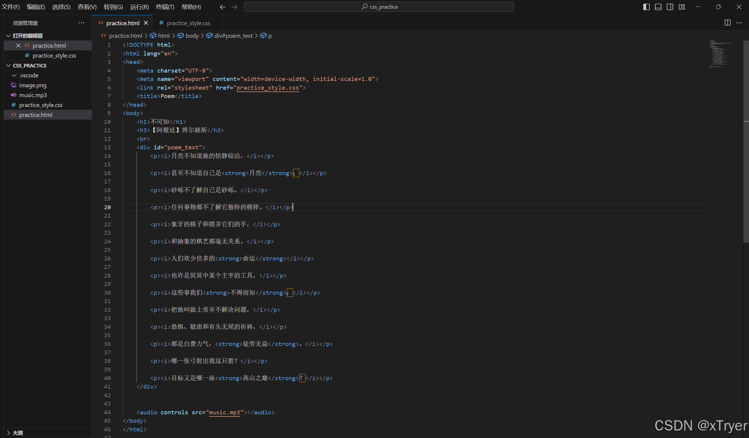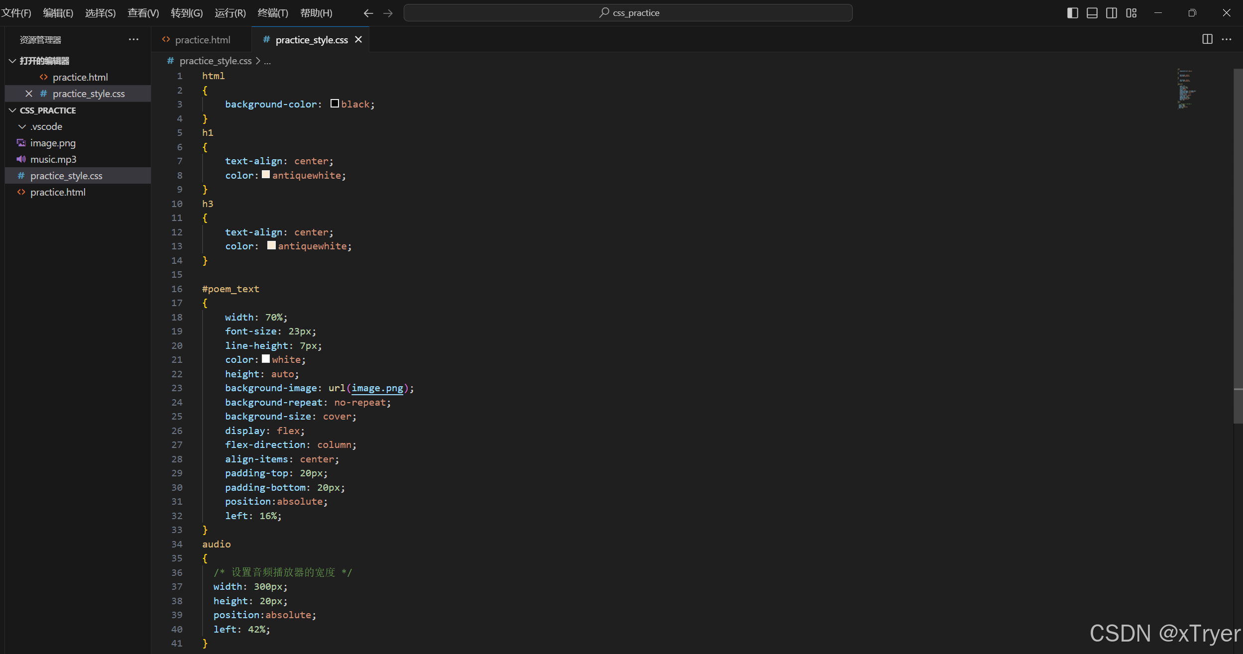 然后我们就可以在style.css文件中实现对该html网页的元素样式的编辑,我们不妨直接复制第一种方法style标签内的样式: