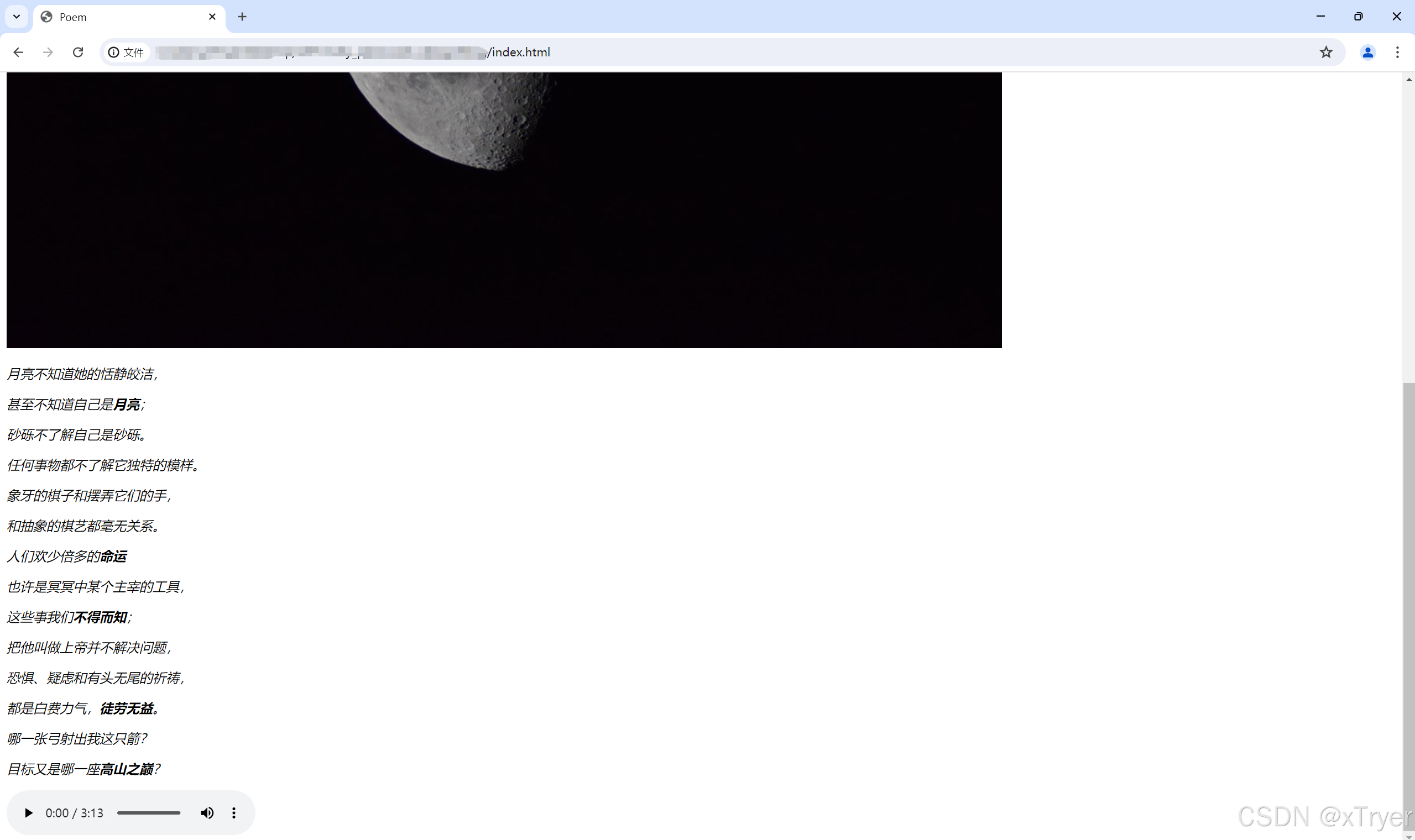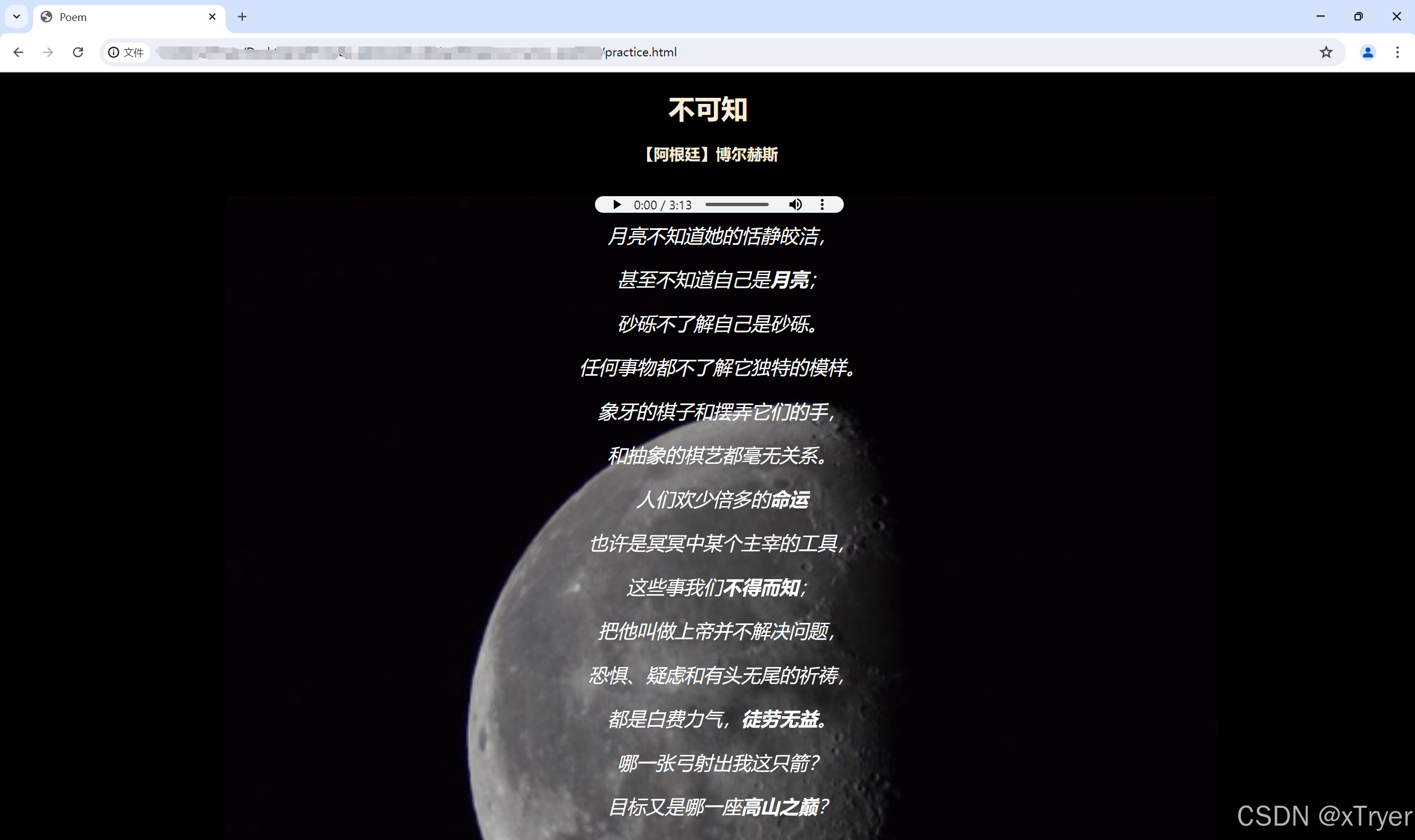 html { background-color: black; } h1 { text-align: center; color:antiquewhite; } h3 { text-align: center; color: antiquewhite; } #poem_text { width: 70%; font-size: 23px; line-height: 7px; color:white; height: auto; background-image: url(image.png); background-repeat: no-repeat; background-size: cover; display: flex; flex-direction: column; align-items: center; padding-top: 20px; padding-bottom: 20px; position:absolute; left: 16%; } audio { /* 设置音频播放器的宽度 */ width: 300px; height: 20px; position:absolute; left: 42%; }