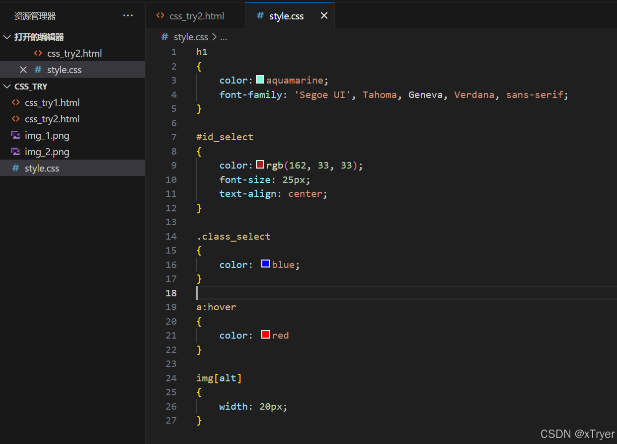 h1 { color:aquamarine; font-family: 'Segoe UI', Tahoma, Geneva, Verdana, sans-serif; } #id_select { color:rgb(162, 33, 33); font-size: 25px; text-align: center; } .class_select { color: blue; } a:hover { color: red } img[alt] { width: 20px; }