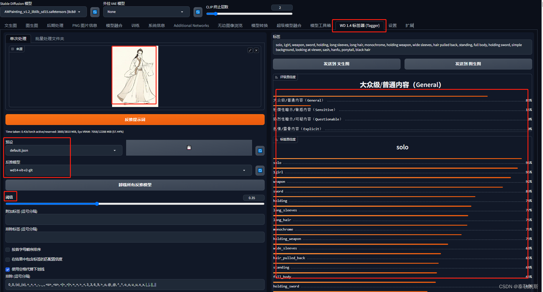 如下图所示,点击tagg,拖入图片,就出现了所有提示词,并且可以根据阈值进行过滤