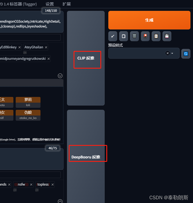 本章主要讲一个反推提示词的插件tagg. 我们平时通过CLIP和DEEPBORU来反推提示词,但是这两个太慢,并且容易出错
