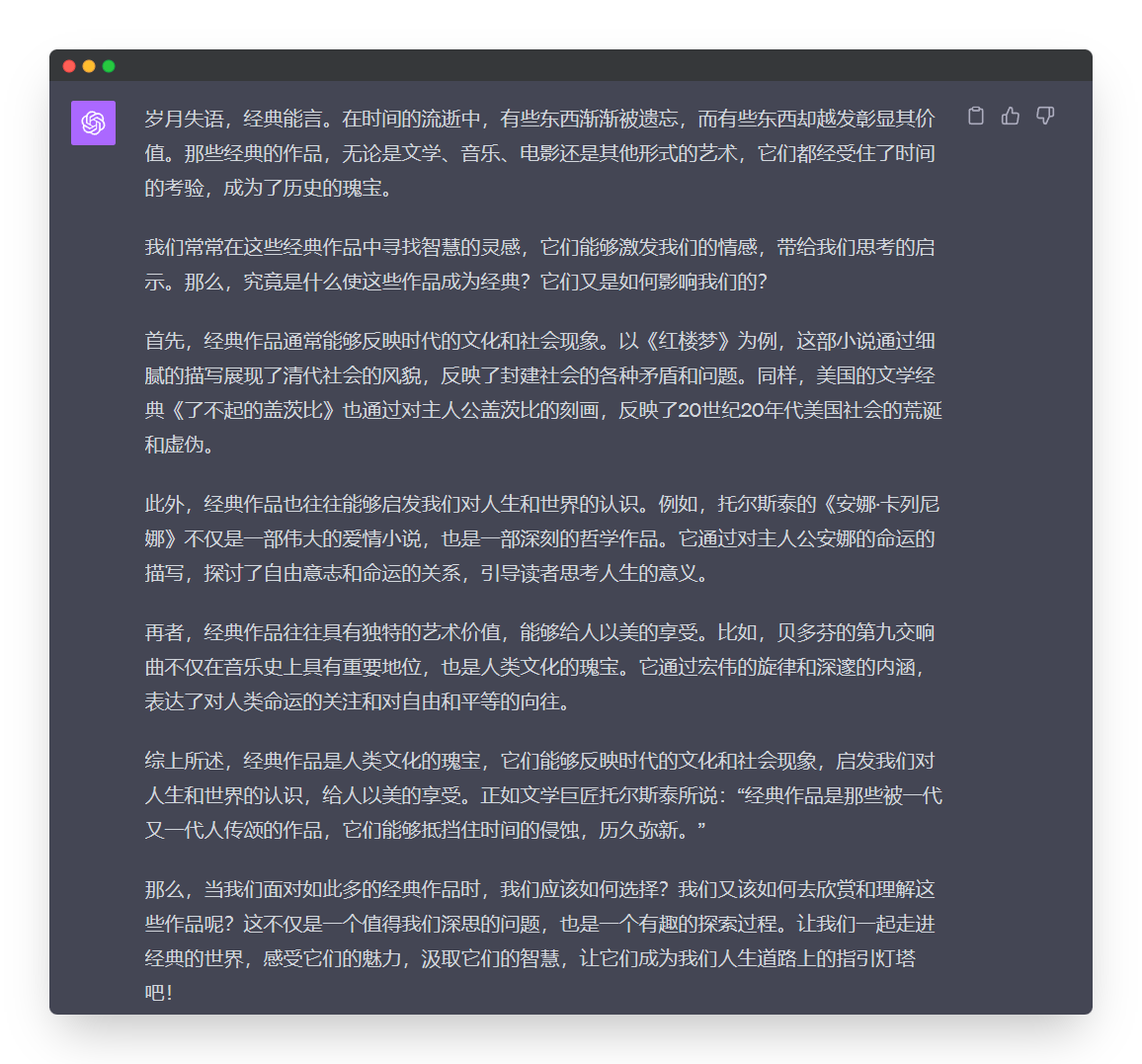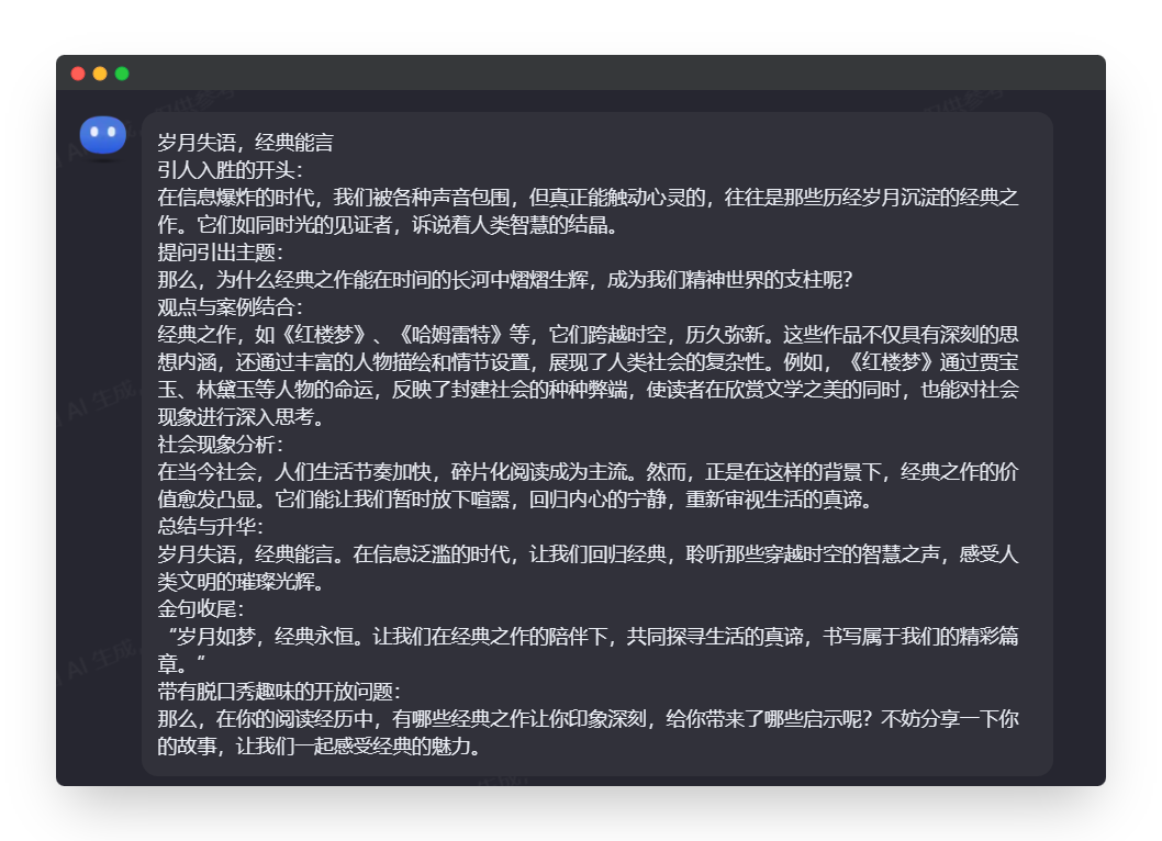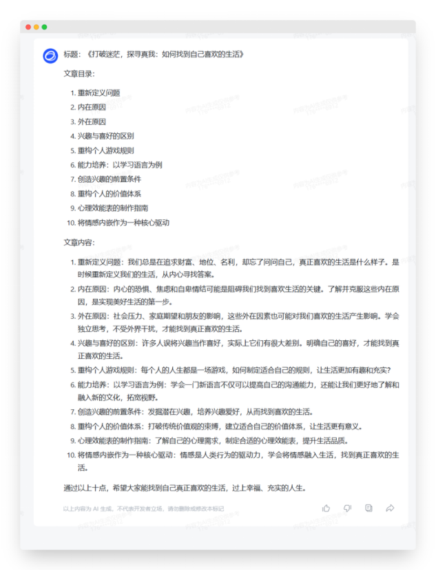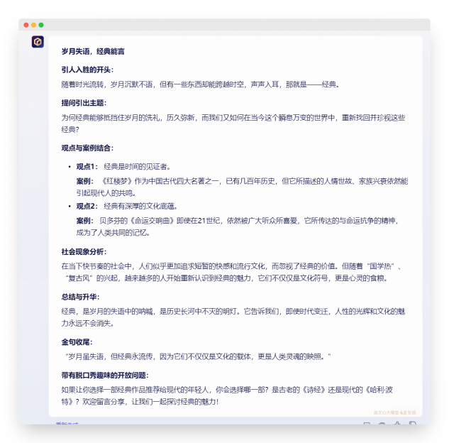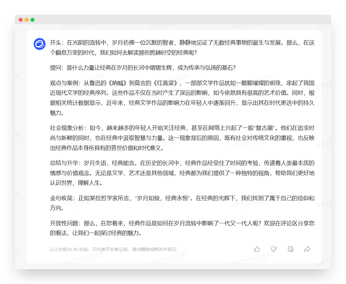值得一提的是,我没有在提示词中刻意约束“请你生成内容的时候不要输出我提供的这些框架和标题,直接为我生成文章”。国内三家都没有做到这一点,而 ChatGPT 4.0 自动理解了我的需求,按这个模式生成了内容。这不能怪我尬吹吧,确实聪明啊。 |