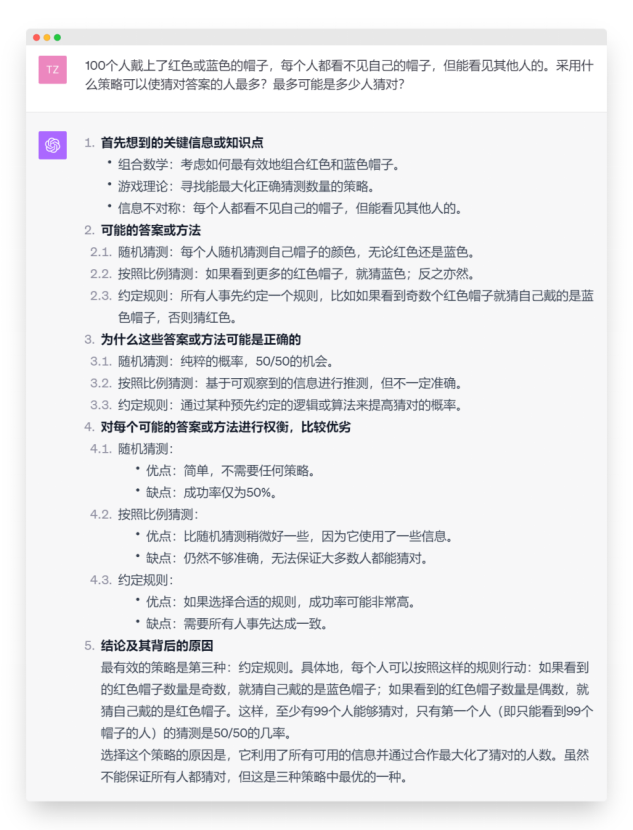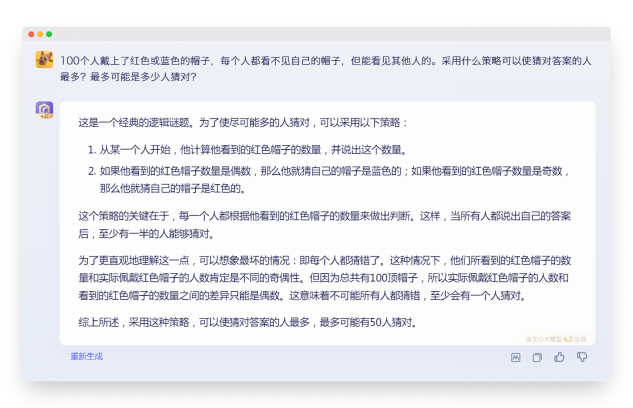 100个人戴上了红色或蓝色的帽子,每个人都看不见自己的帽子,但能看见其他人的。采用什么策略可以使猜对答案的人最多?最多可能是多少人猜对? |