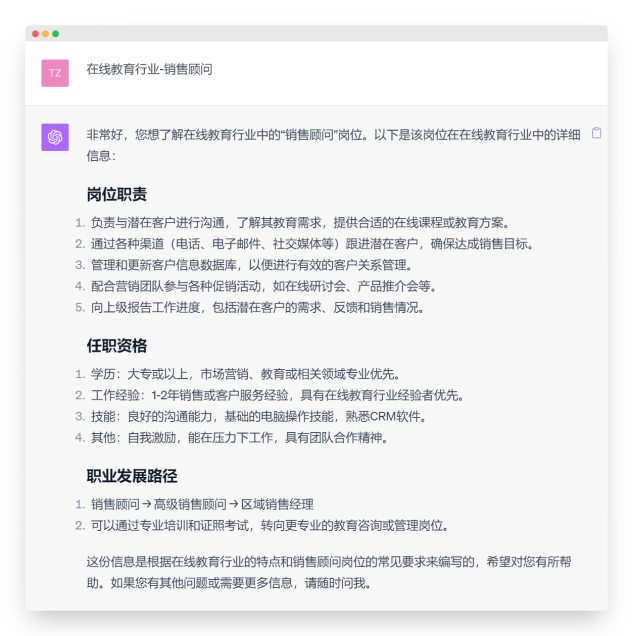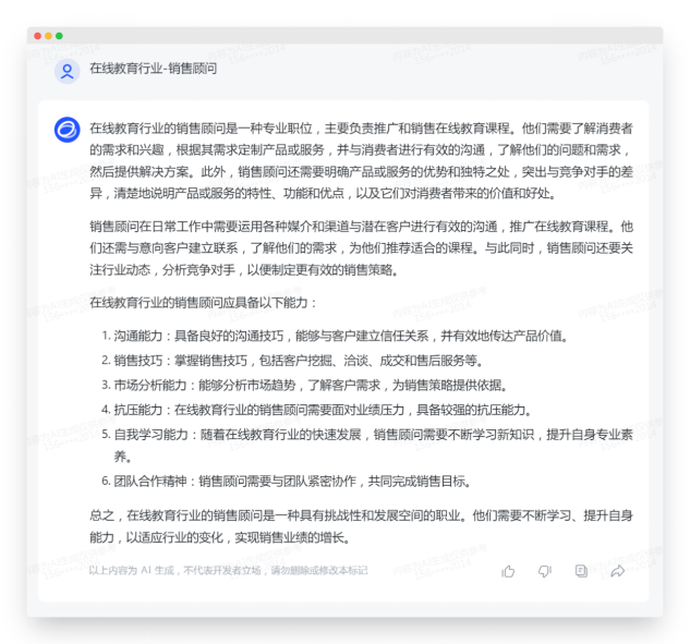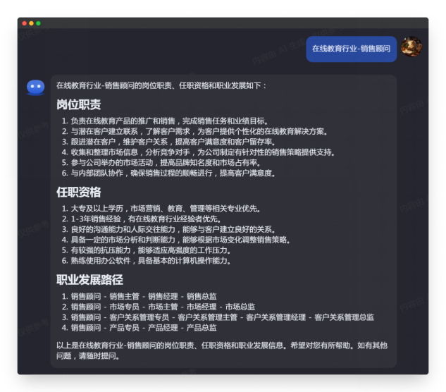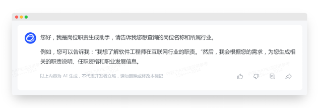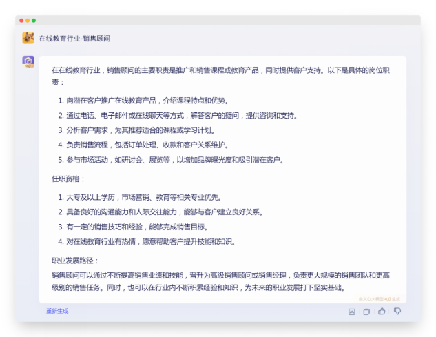 虽然理解了提示词的基本需求,但没有理解提示词约束的生成内容格式(以岗位职责、任职资格和职业发展三个标题来生成JD)