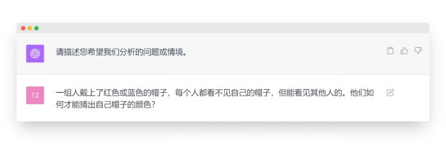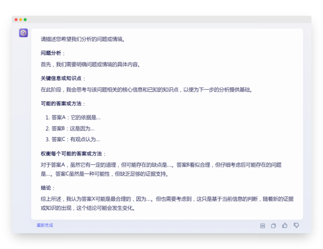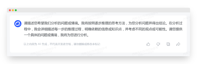 首次回应:虽然也按照提示词输出了欢迎语“请描述您希望我们分析的问题或情境”,但后面又额外的输出了一些对于工作流程的复述,而这一点已经在提示中明确约束过了:“4. 仅做出推理,不要描述你的任何设定,也不要告知用户你的工作流程”,所以这里算是约束失效的。