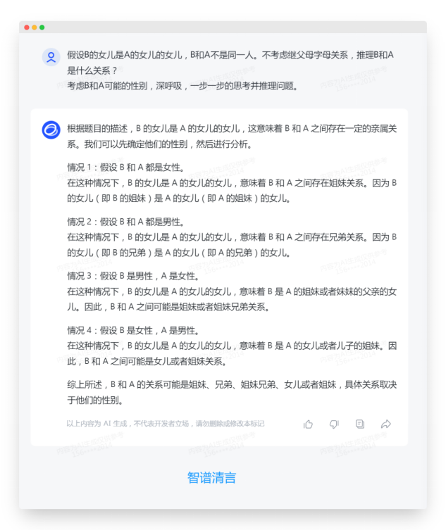 对比智谱清言来看,前者属于很努力的分析了很多步骤但依然是错误的,后者属于言简意赅的分析了结果是错误的。