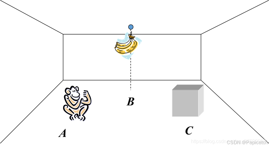 房间里有一只猴子、一个箱子和挂在天花板上够不着的香蕉。猴子可以在房间里走动、推箱子、爬上箱子够到香蕉。