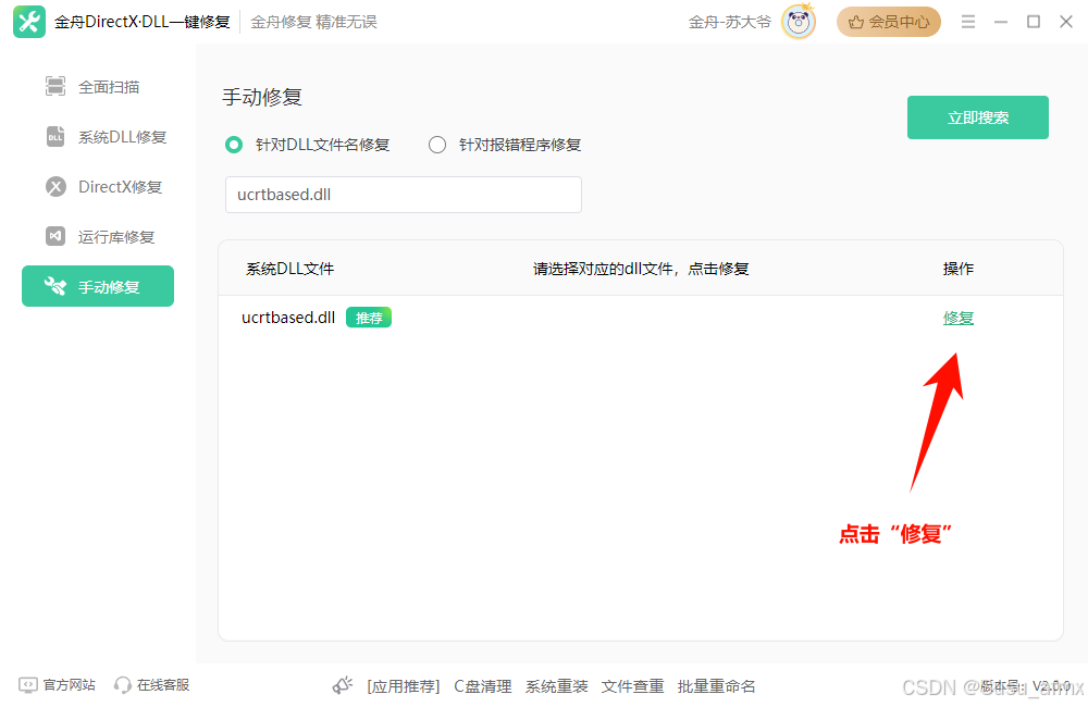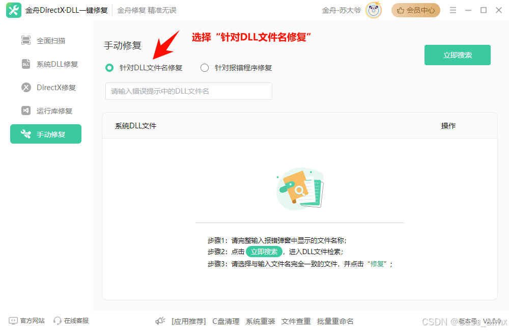 步骤:进入金舟DirectX·DLL一键修复,软件页面在左侧功能栏中选择【手动修复】功能,点击【立即扫描】。