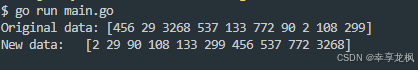 package main import ( "demo/pkg" "fmt" ) func main() { // 定义一个切片,这里我们模拟 10 个元素 arr := []int{456, 29, 3268, 537, 133, 772, 90, 2, 108, 299} fmt.Println("Original data:", arr) // 先打印原始数据 pkg.InsertionSort(arr) // 调用插入排序 fmt.Println("New data: ", arr) // 后打印排序后的数据 }