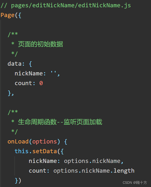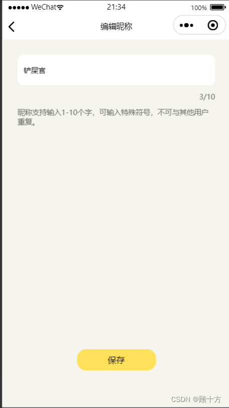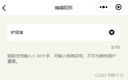 并在editNickname页面进行接收,当页面加载时初始化并赋值给页面参数,使用count来获取当前输入框的字符个数,限制输入不超过10个