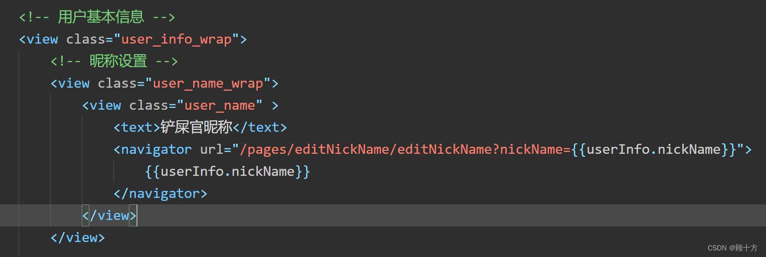 首先进行用户昵称编辑功能的编写,铲屎官昵称采用了navigator标签,当点击昵称时会自动跳转到昵称编辑页面。