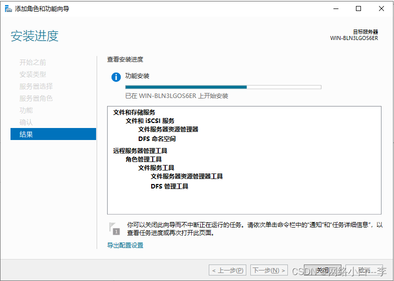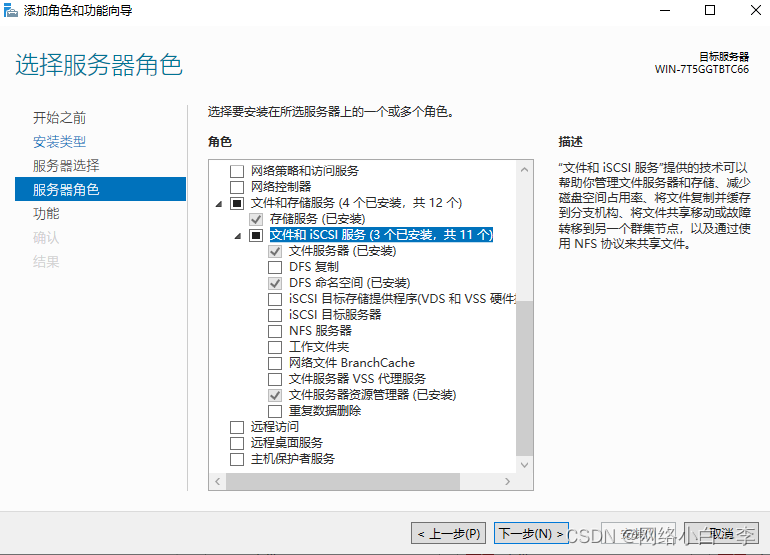 默认点击下一步,到服务器角色选择文件盒储存服务,文件和iscsl服务,选择命名空间以及文件服务器资源管理器点击下一步
