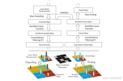 上图左边是反卷积化,右边卷积化操作,通过中间的switch(开关)记录最大值在原始像素空间的位置(黑白图展示)。