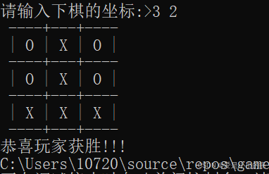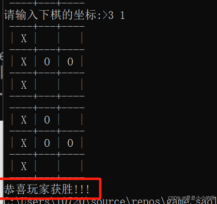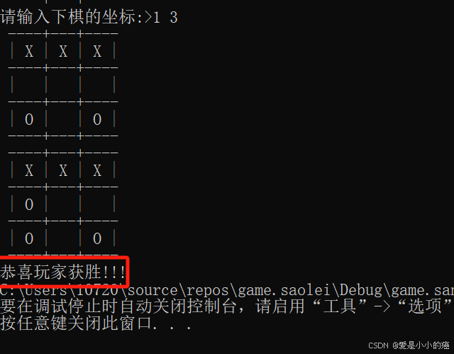 int WinChess(char board[ROW][COL], int row, int col) { int i = 0; int j = 0; for (i = 0; i < row; i++)//判断行获胜 { int Asum = 0; int Bsum = 0; for (j = 0; j < col; j++) { if (board[i][j] == 'X') { ++Asum; if (Asum == 3) return 1; } else if(board[i][j] == 'O') { ++Bsum; if (Bsum == 3) return 2; } } }