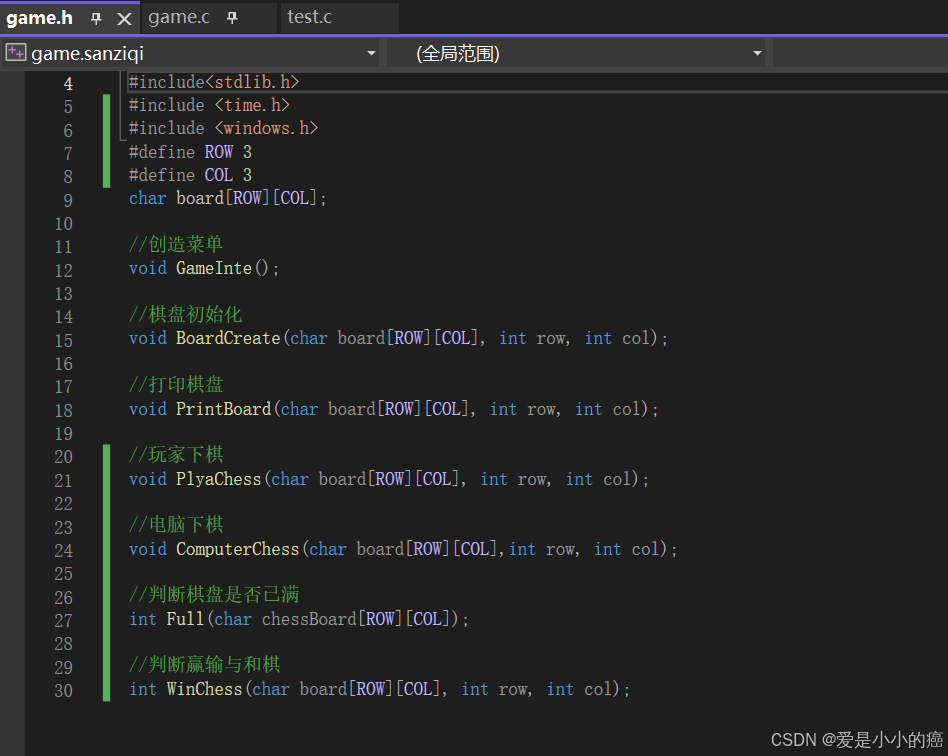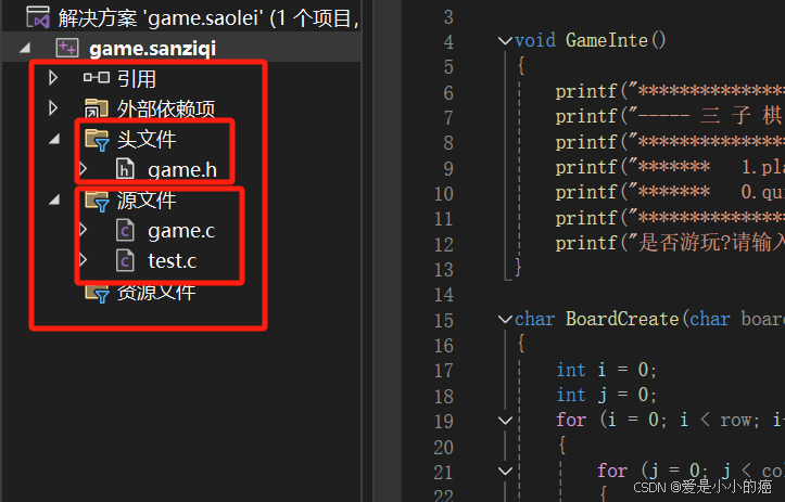 与之前的扫雷游戏一样,还是需要分成头文件game.h,源文件game.c,源文件test.c三个文件。