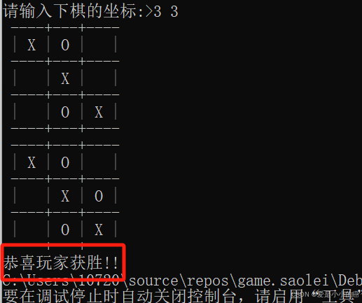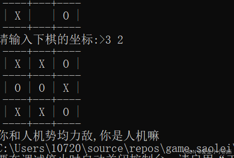 注意,此时我们在主函数中在判断胜利或失败之前加入的,判断是否为和棋的代码中,又加入了判断玩家是否胜利,因为可能玩家最后下的这一枚棋正好导致了棋子填满并且玩家获胜。加入这段判断就不会导致明明在最后一刻棋子满的时候胜利了,却被说是和棋了。