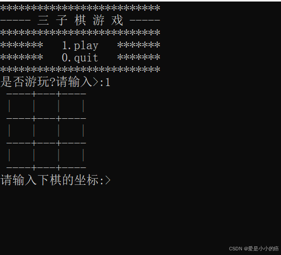 void GameInte() { printf("**************************\n"); printf("----- 三 子 棋 游 戏 -----\n"); printf("**************************\n"); printf("******* 1.play *******\n"); printf("******* 0.quit *******\n"); printf("**************************\n"); printf("是否游玩?请输入>:"); }