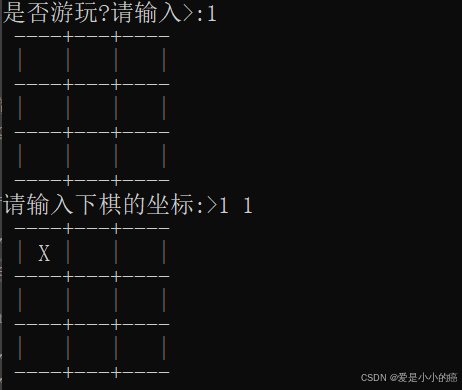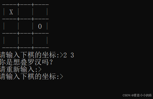 void PlyaChess(char board[ROW][COL], int row, int col) { int a; int b; while (1) { printf("请输入下棋的坐标:>"); scanf("%d %d", &a, &b); int m = a - 1; int n = b - 1; if(a<=0||a>=row+1||b<=0||b>=col+1) { printf("输入错误,请重新输入:>"); continue; } else if(board[m][n]!=' ') { printf("你是想叠罗汉吗?\n"); printf("请重新输入:>\n"); continue; } board[m][n] = 'X'; PrintBoard(board, ROW, COL); break; } }