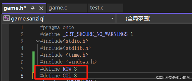 因为需要创建一个3*3的棋盘,所以我们可以创建一个char型的二维数组,board[ROW][COL],(我们把ROW和COL创建成常量,因为是三子棋直接设置成ROW和COL的值都为3就好,如此一来,如果以后像制作五子棋之类的棋盘就会更加简单。像这样:)