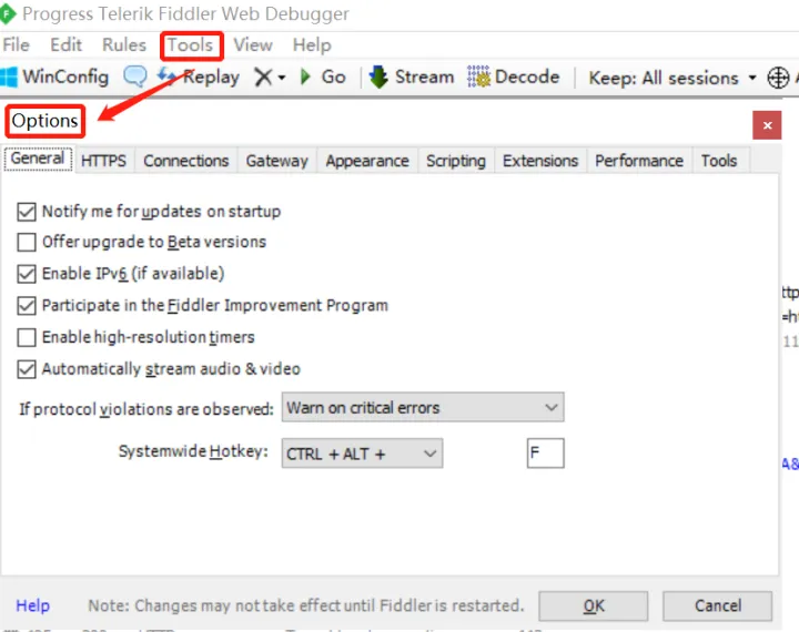 Progress Telerik Fiddler Web Debugger菜单栏中,Tools——Options。