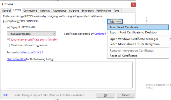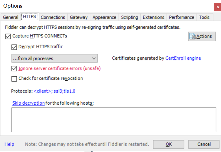 勾选Capture HTTPS CONNECTs、Decrypt HTTPS traffic、Ignore server certificate errors(unsafe)。