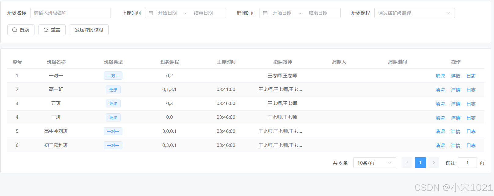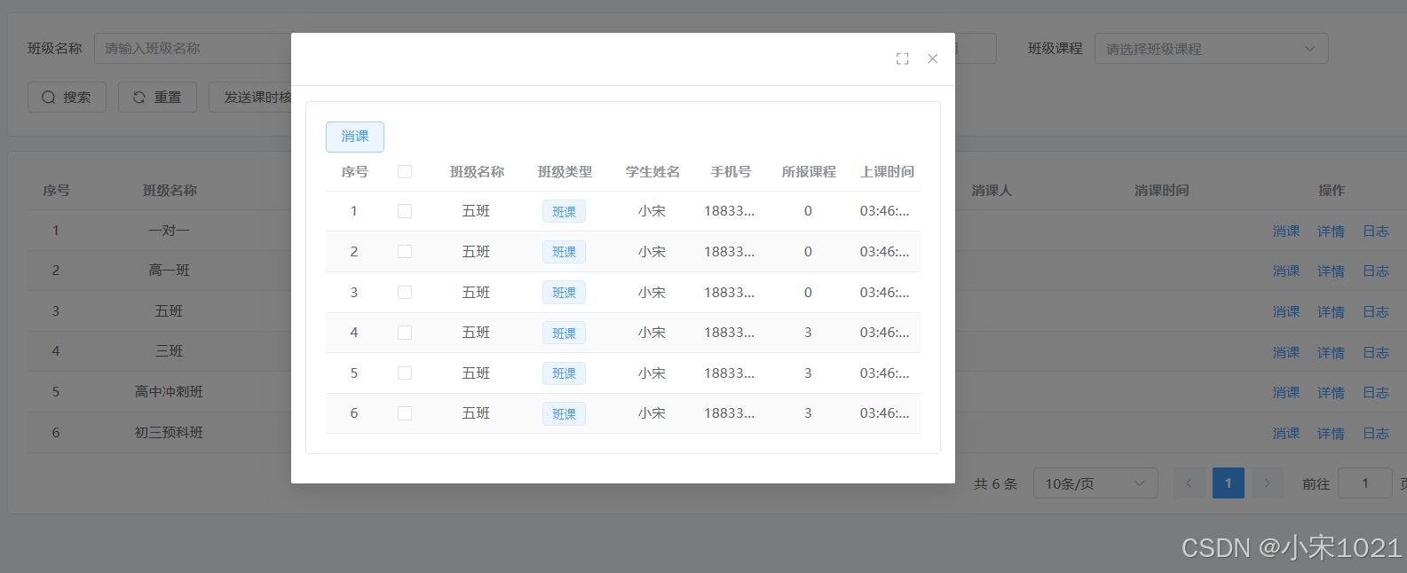 目的:多表联查获取到每个班级里面所有的学生上课的信息。点击消课插入到消课主表和消课子表,主表记录班级信息,消课人员信息,上课时间。子表记录上课学员的信息,学员姓名、手机号、班级名称、班级类型、上课时间、老师名称