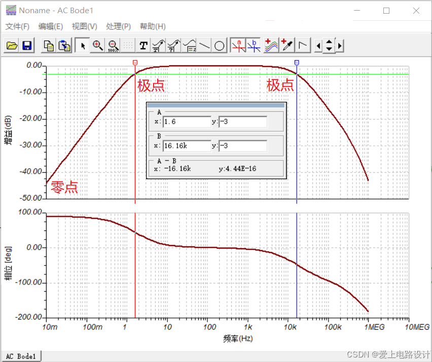 1)0Hz零点处(TINA仿真无法从0Hz开始),幅频特性曲线开始有 20dB/10倍频的斜率。