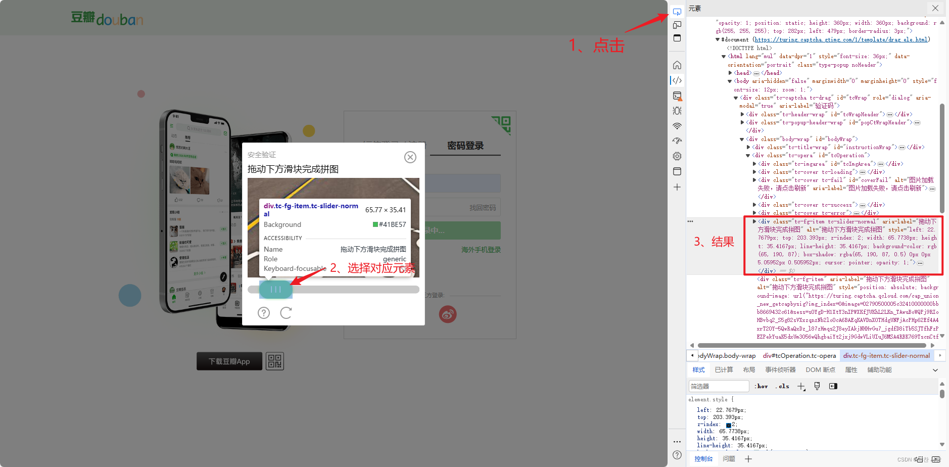 element = driver.find_element(By.XPATH, "//input[@id='username']") # 定位元素 element.send_keys("18230630095") # 输入内容 element = driver.find_element(By.XPATH, "//input[@id='password']") # 定位元素 element.send_keys("123456") # 输入内容 element = driver.find_element(By.XPATH, "//a[text()='登录豆瓣']") # 定位元素 element.click() # 点击按钮