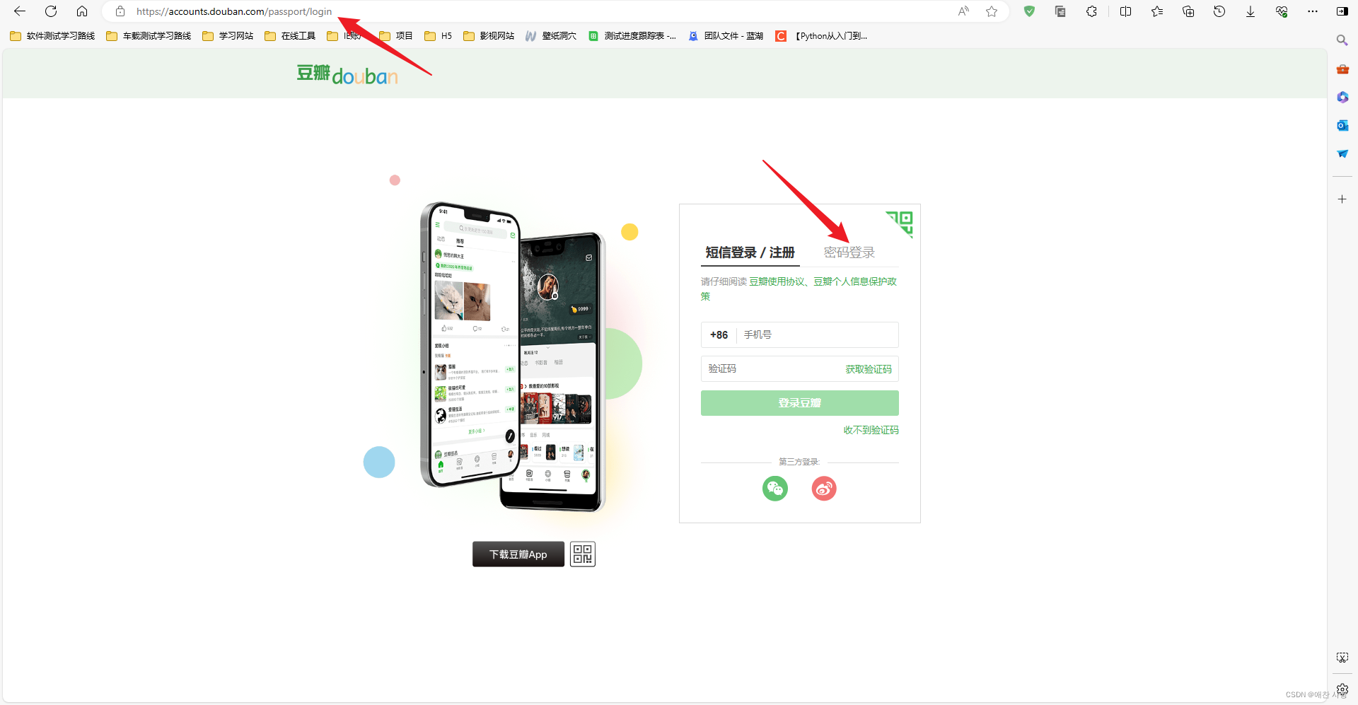driver = webdriver.Edge() # 实例化驱动对象 driver.maximize_window() # 窗口最大化 driver.get("https://accounts.douban.com/passport/login") # 打开豆瓣登录页面 driver.implicitly_wait(5) # 隐式等待5秒 element = driver.find_element(By.XPATH, "//li[text()='密码登录']") # 定位【密码登录】元素 element.click() # 点击确认