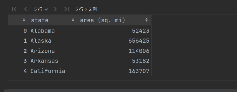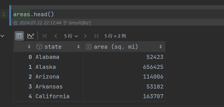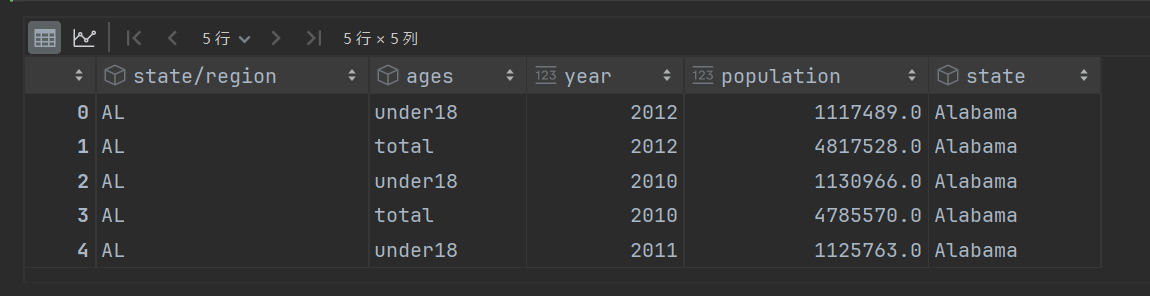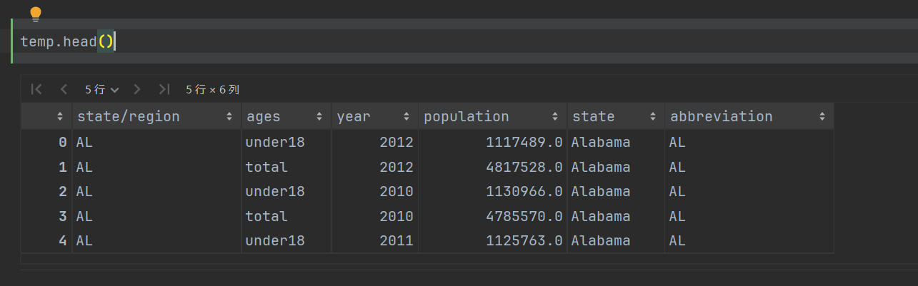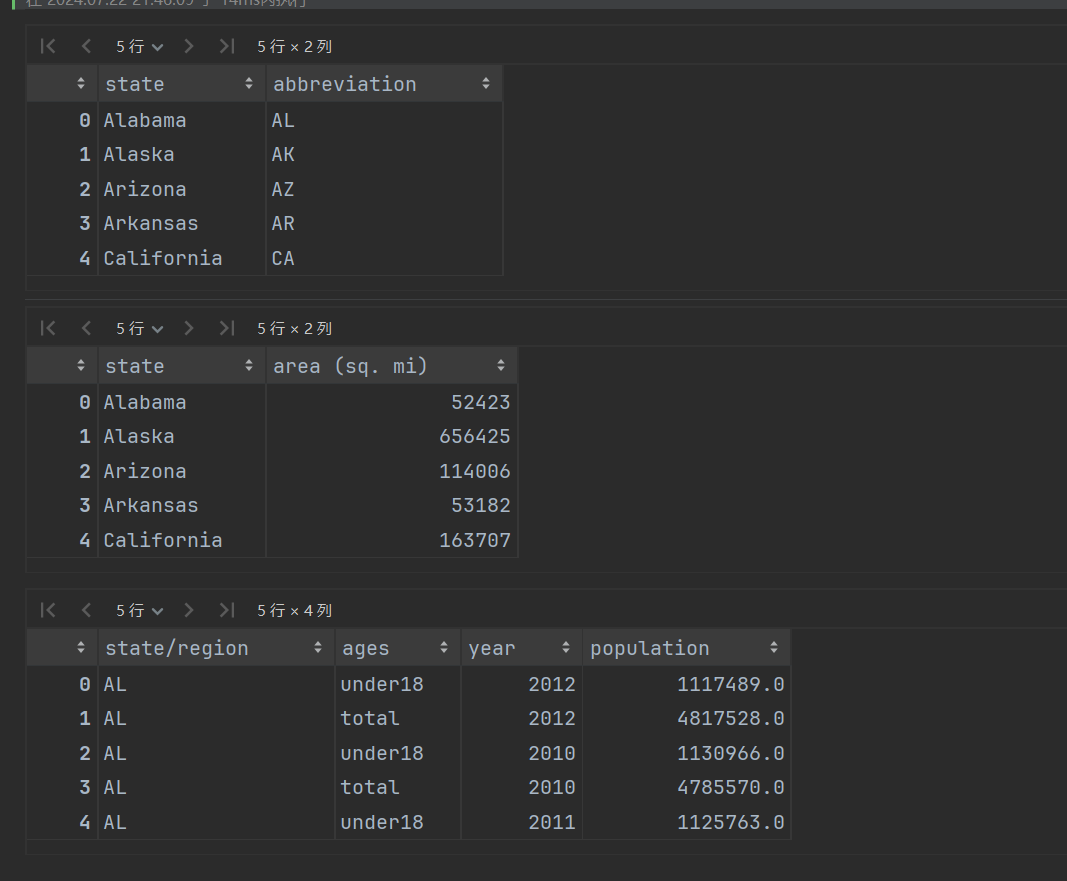 import numpy as np import pandas as pd 首先导入文件,并查看数据样本 # 州的全称和州名称简写对应关系表 abb = pd.read_csv('./data/state-abbrevs.csv') # 州的全称和面积表 areas = pd.read_csv('./data/state-areas.csv') # 州名称的简写和面积表,包括年龄和年份信息 population = pd.read_csv('./data/state-population.csv') display(abb.head(), areas.head(), population.head())