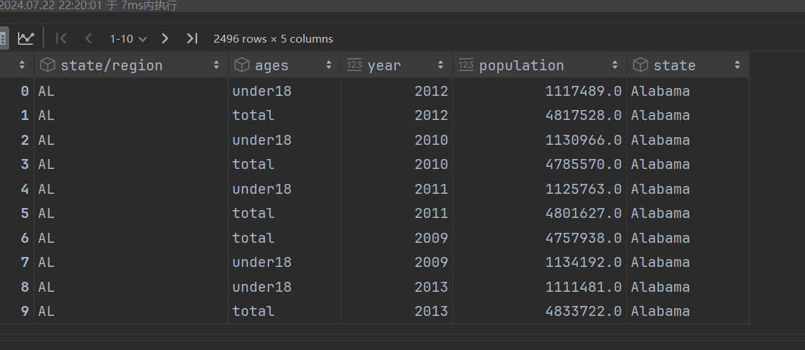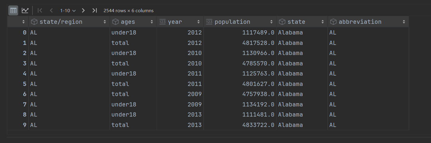 # 根据某一列或几列来合并 # 默认合并的规则是查找字段名称相同的列 # 合并的列在内容上,要存在一对一、一对多、多对多的关系 pd.merge(left=population, right=abb, left_on='state/region', right_on='abbreviation', how='inner