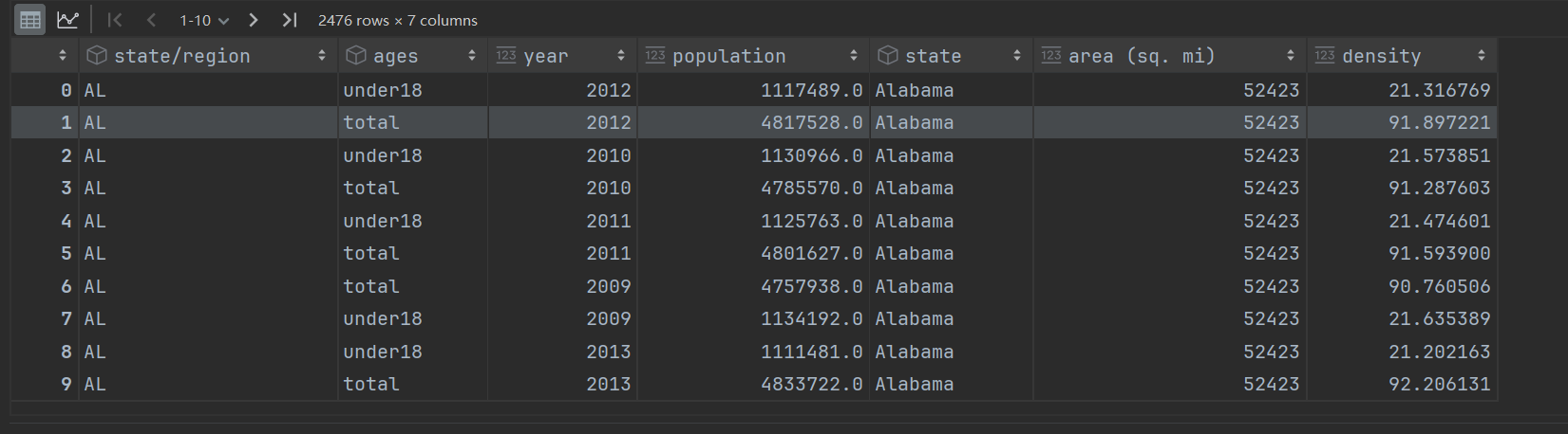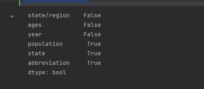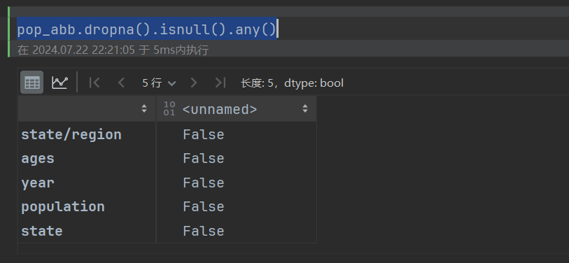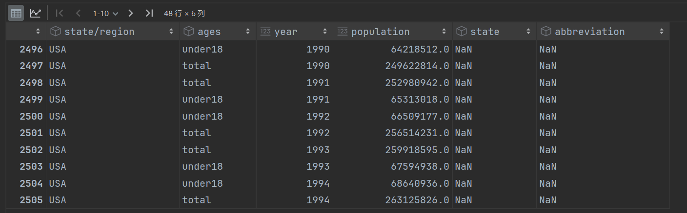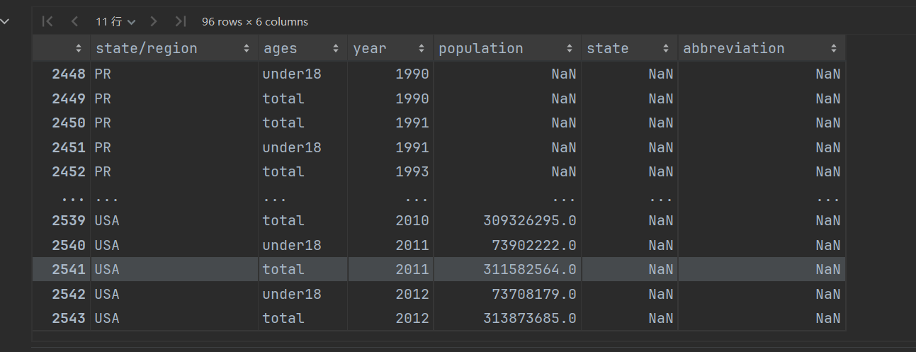# 由于2000年之前,并没有统计过PR州的人口数据,所以删除 pop_abb.loc[pop_abb.population.isnull()] pop_abb.isnull().any() pop_abb.dropna().isnull().any()