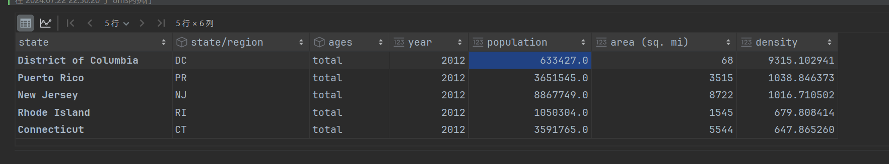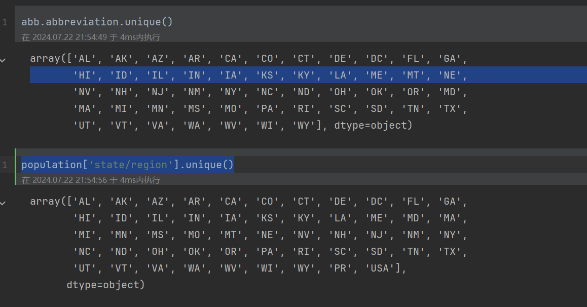 # PR USA这两个简称,在abb表中,是不存在的 set(population['state/region'].unique()) - set(abb.abbreviation.unique())