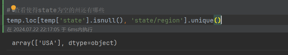 temp.loc[temp['state/region'] == 'PR', 'state'] = 'Puerto Rico' # 查看使得state为空的州还有哪些 temp.loc[temp['state'].isnull(), 'state/region'].unique()