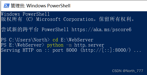 首先开启power shell,在服务端本地创建一个文件夹用于开启http服务,例如创建了一个E:\WebServer文件夹,如图所示: