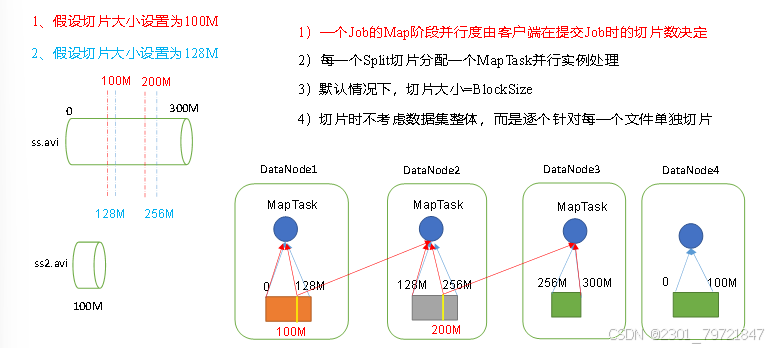 数据切片:数据切片只是在逻辑上对输入进行分片,并不会在磁盘上将其切分成片进行存储。数据切片是MapReduce程序计算输入数据的单位,一个切片会对应启动一个MapTask。