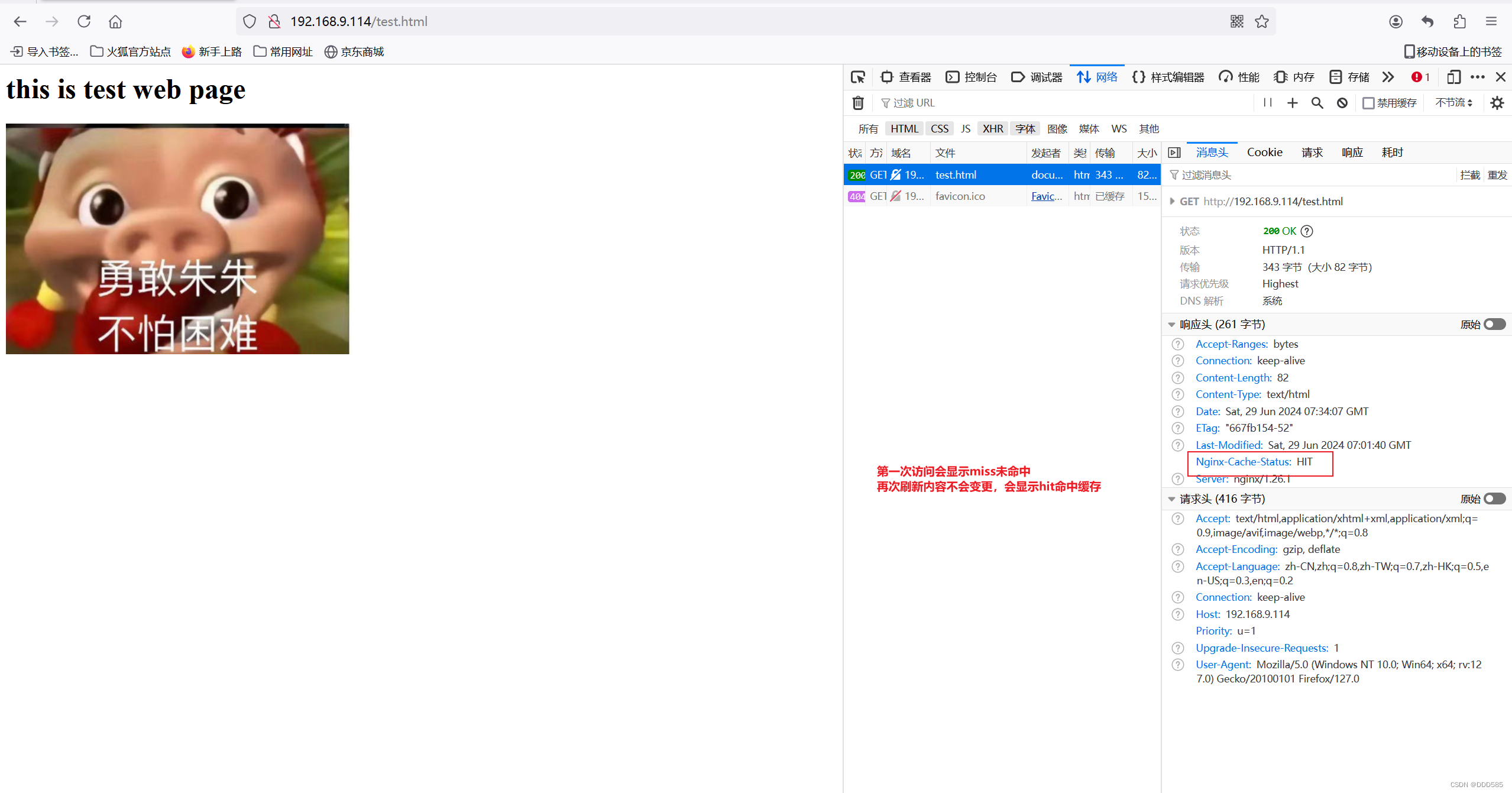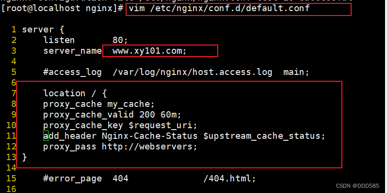 vim /etc/nginx/conf.d/default.conf 删除原本8.9两行 server { listen 80; server_name www.xy101.com; location / { proxy_cache my_cache; #指定用于页面缓存的共享内存,zone名称由proxy_cache_path指令定义 proxy_cache_valid 200 60m; #为不同的响应状态码设置不同的缓存时间,此为缓存状态码为200的请求,缓存时长为60分钟 proxy_cache_key $request_uri; #指定缓存文件的key为请求的URI add_header Nginx-Cache-Status $upstream_cache_status; #把缓存状态设置为头部信息,响应给客户端 proxy_pass http://webservers; #设置代理转发的后端服务器的协议和地址 } systemctl restart nginx