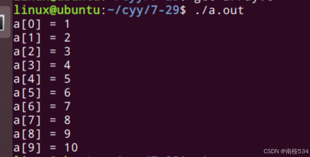 #include int main(void) { int a[10] = {1,2,3,4,5,6,7,8,9,10}; // 初始化数组 int i = 0; for(i = 0;i < 10; ++i) { printf("a[%d] = %d\n",i,a[i]); // 访问数组中的元素 } return 0; }